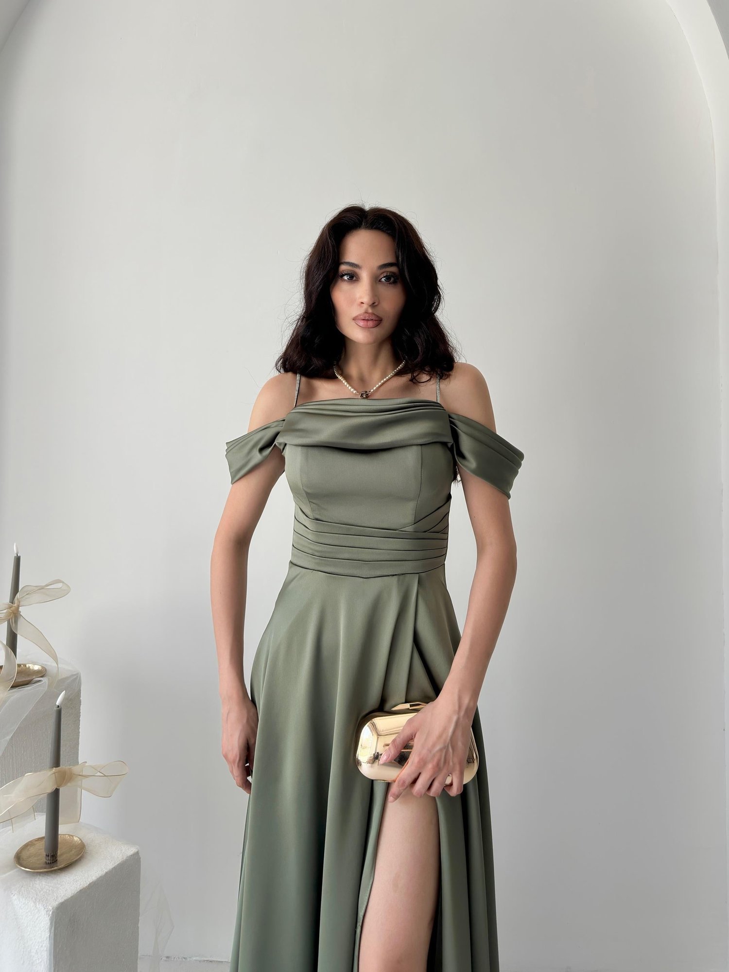 Haki Taş Askılı Düşük Kol Saten Abiye