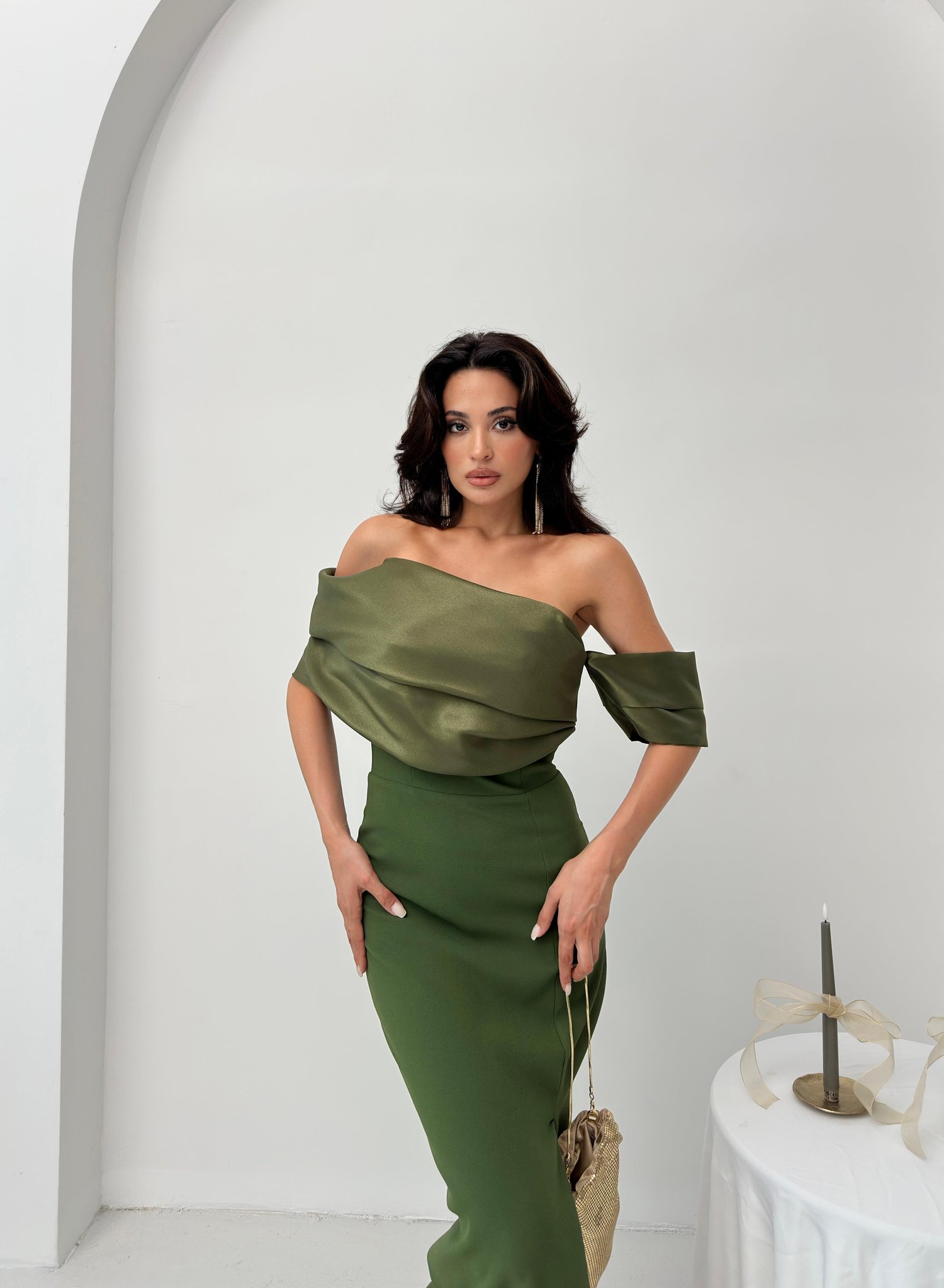 Haki Yaka Detaylı Yırtmaçlı Abiye Elbise