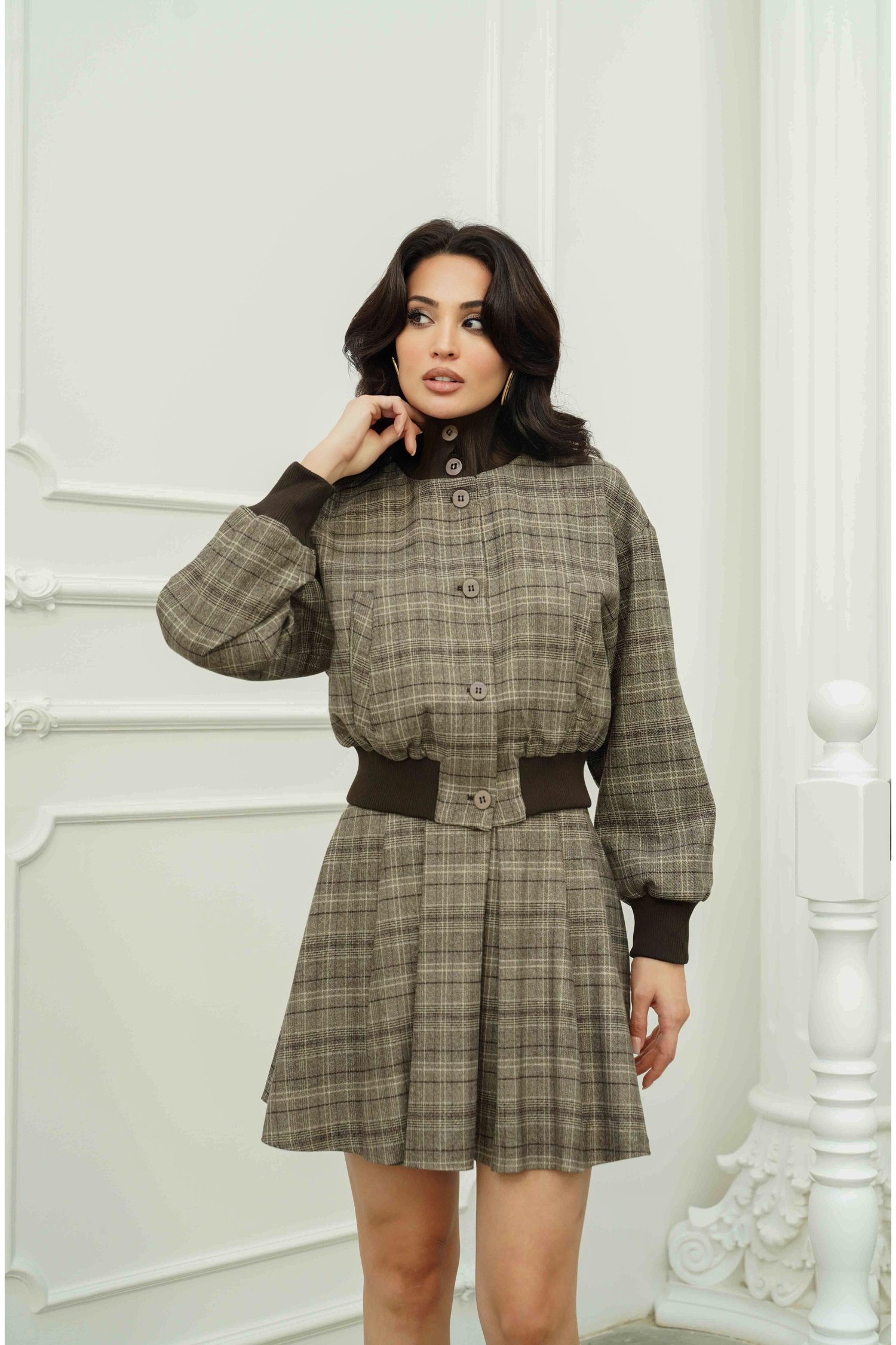Kahve Ekoseli Beli Lastikli Ceket Etek Takım