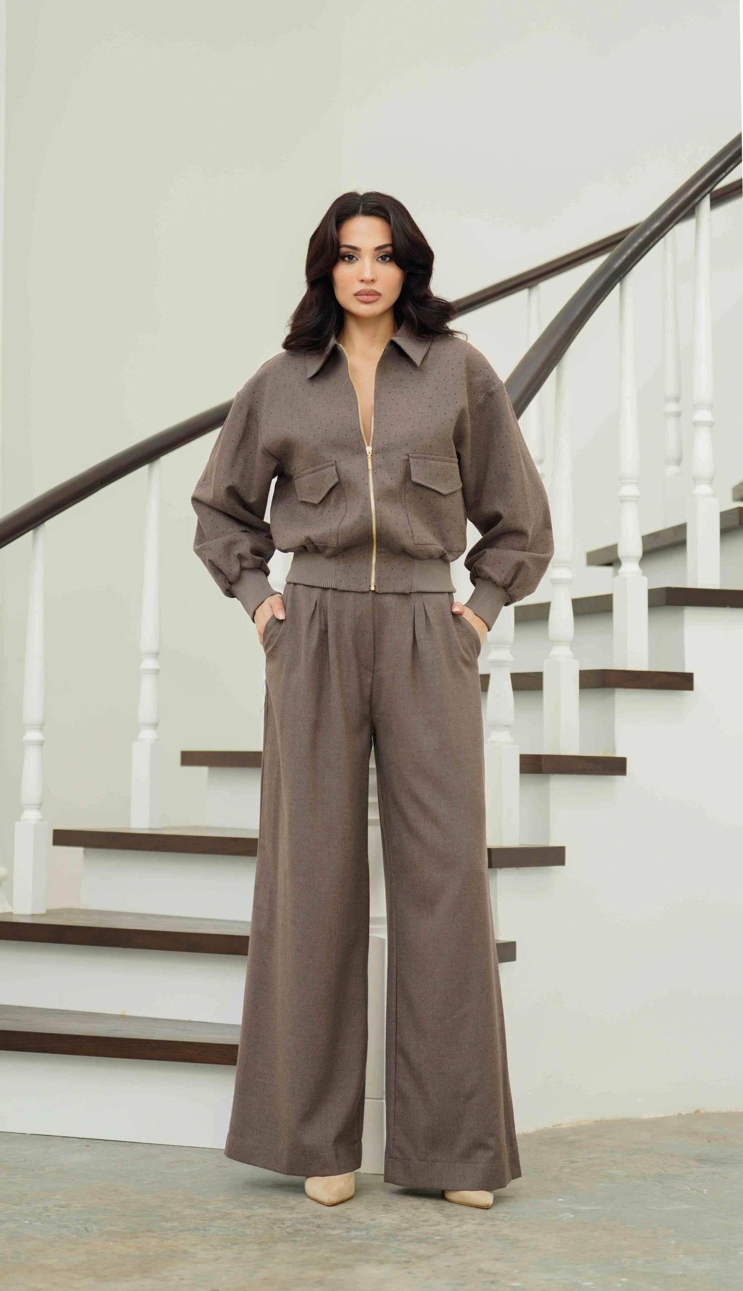 Kahve Fermuarlı Taş İşlemeli Ceket Pantolon Takım