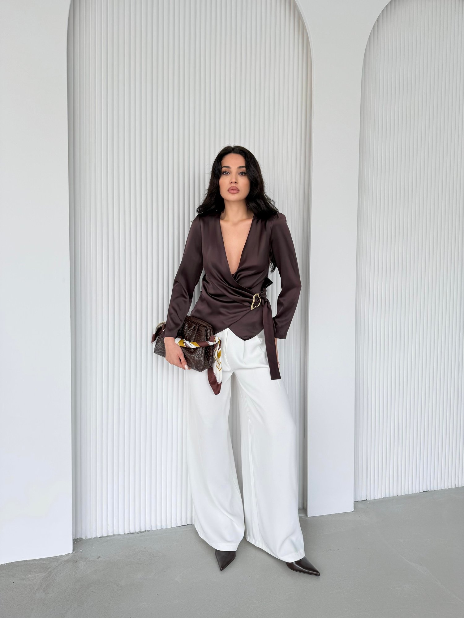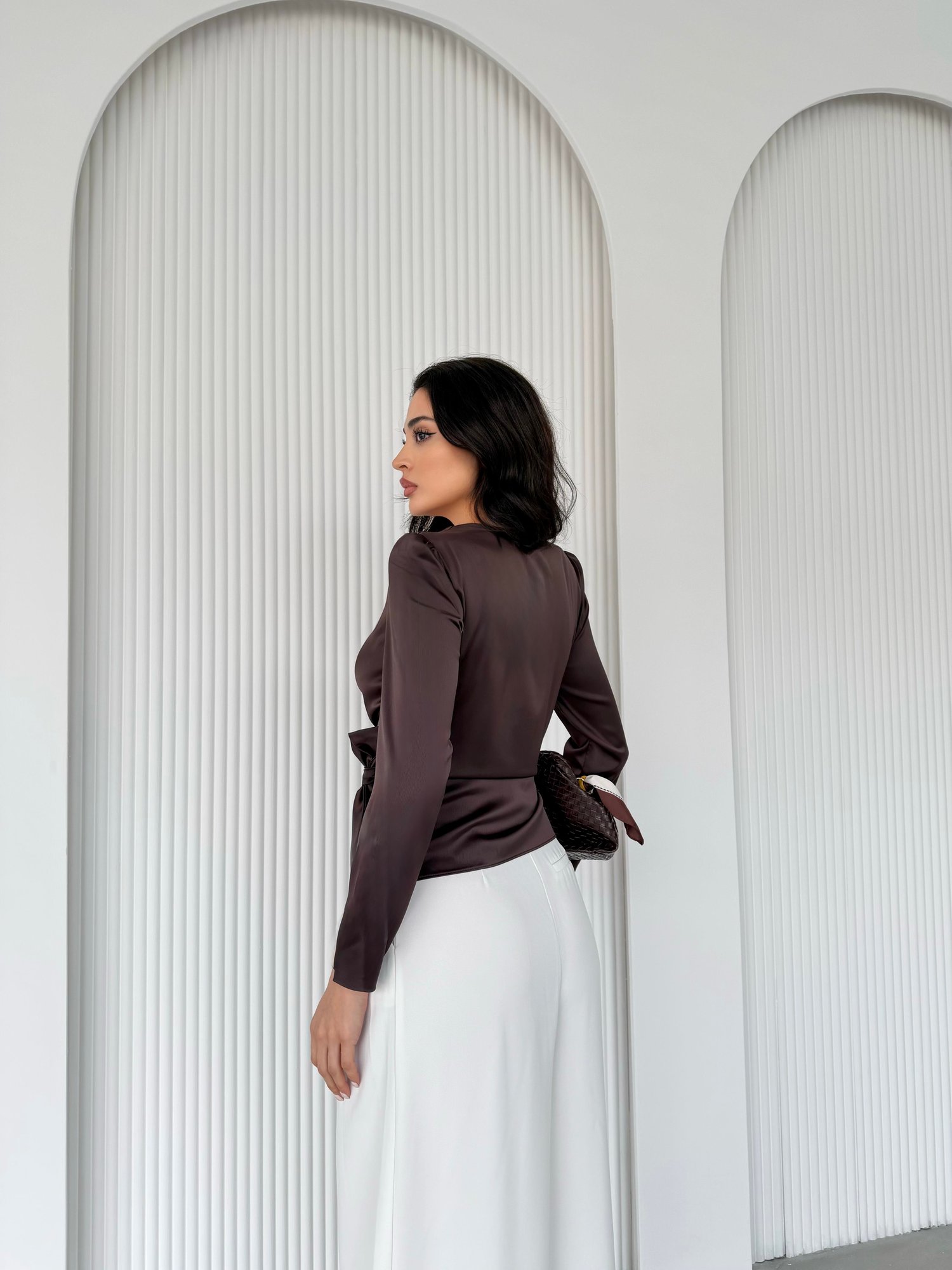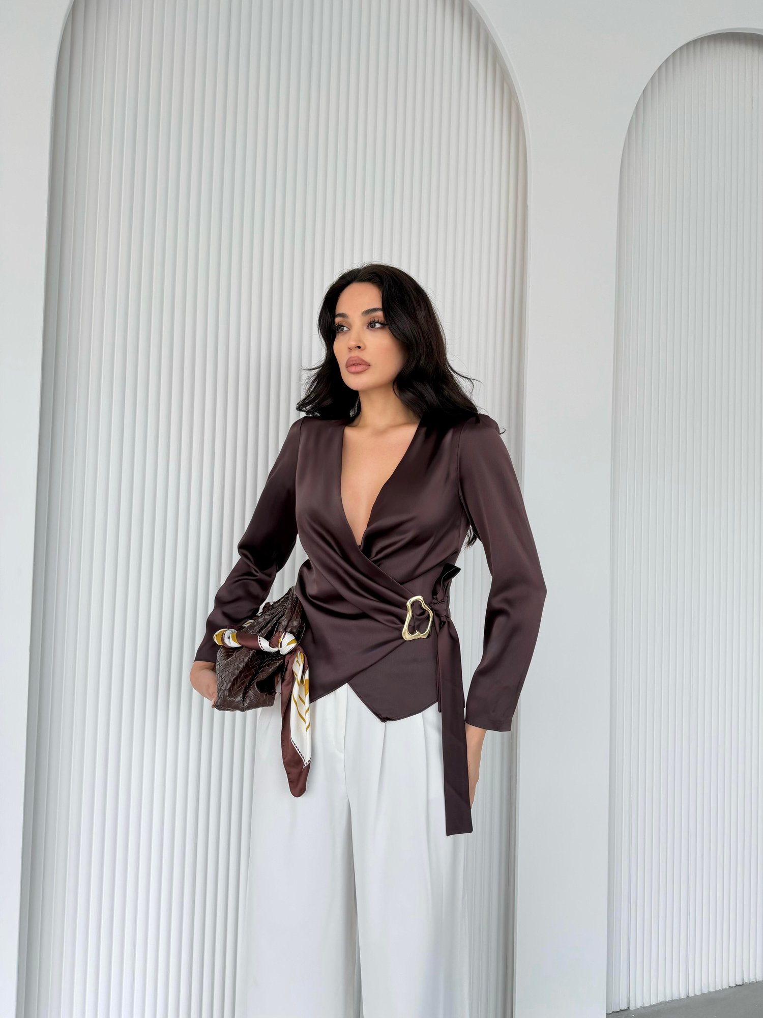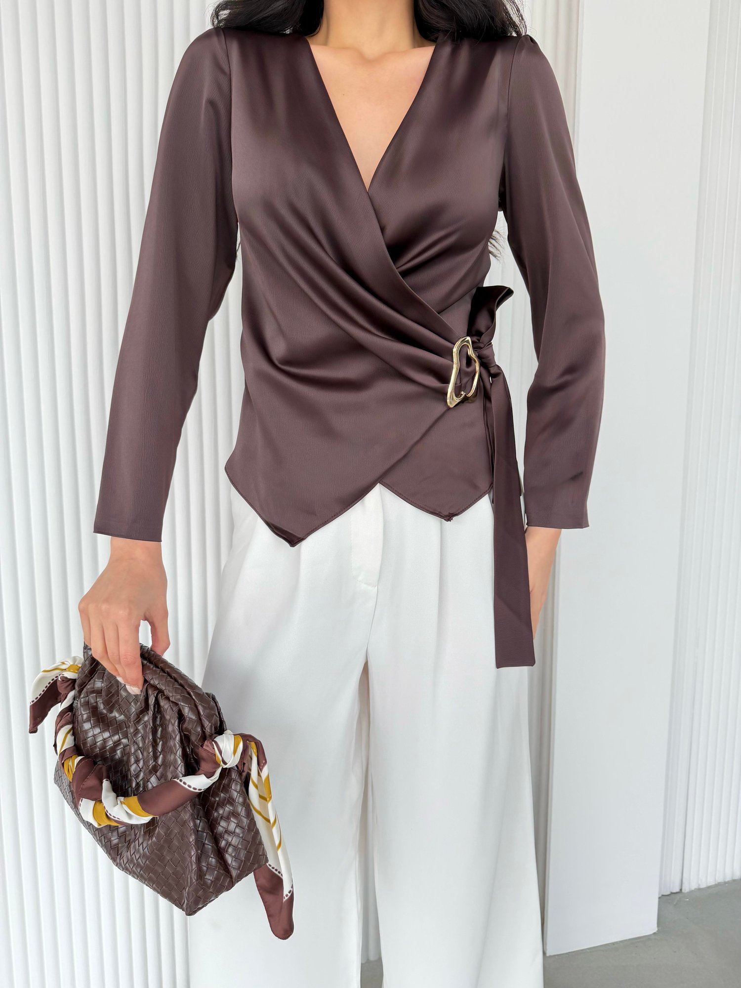 Kahve Kruvaze Yaka Toka Detaylı Saten Bluz