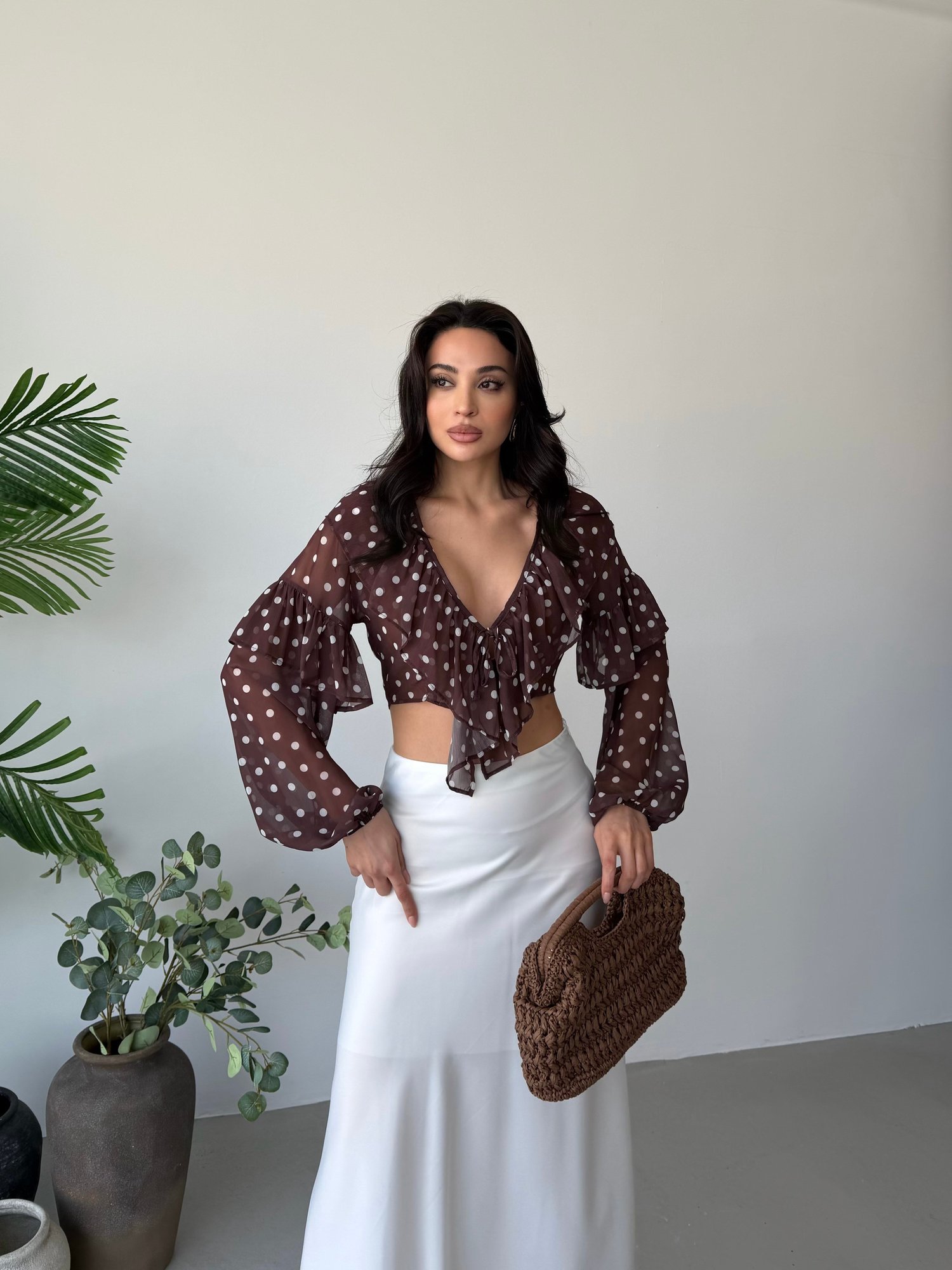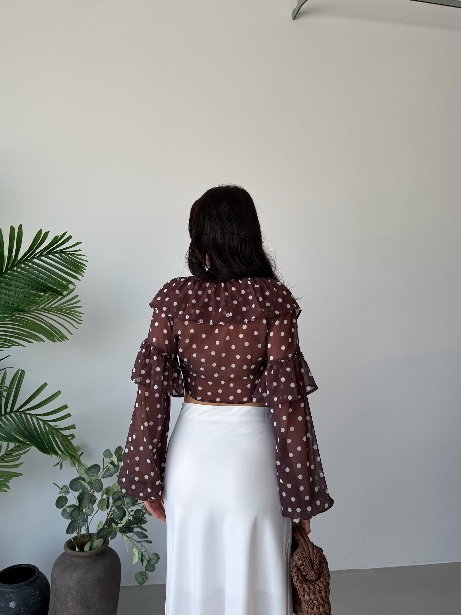 Kahve Puantiyeli Önü Bağlamalı Şifon Crop Bluz