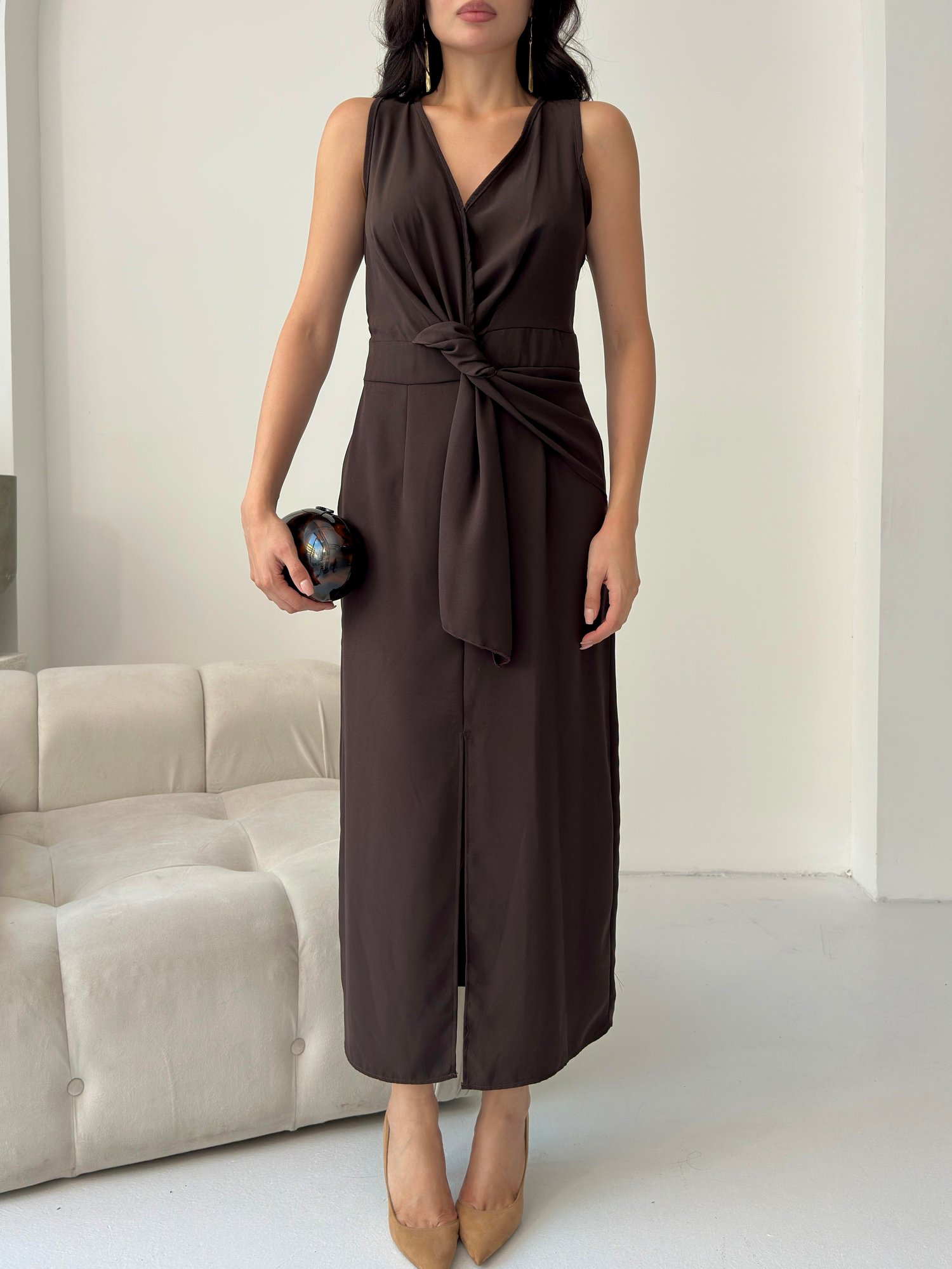 Kahverengi Bağlama Detaylı Midi Elbise