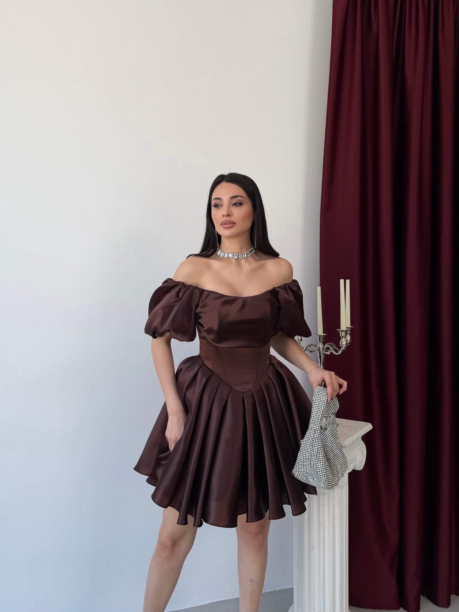 Işıltılı ve iddialı tasarımıyla öne çıkan bu mini abiye elbise, modern prenses siluetiyle dikkat çeker. Düşük omuz (off-shoulder) yaka detayı ve hacimli balon kollar omuz hattını zarifçe vurgularken, korse formundaki üst beden vücudu toparlayarak kusursuz bir görünüm sunar. Belden itibaren genişleyen volanlı etek yapısı hareketli ve feminen bir duruş kazandırır. Parlak saten dokusu sayesinde ışığı yansıtarak göz alıcı bir etki yaratır.
