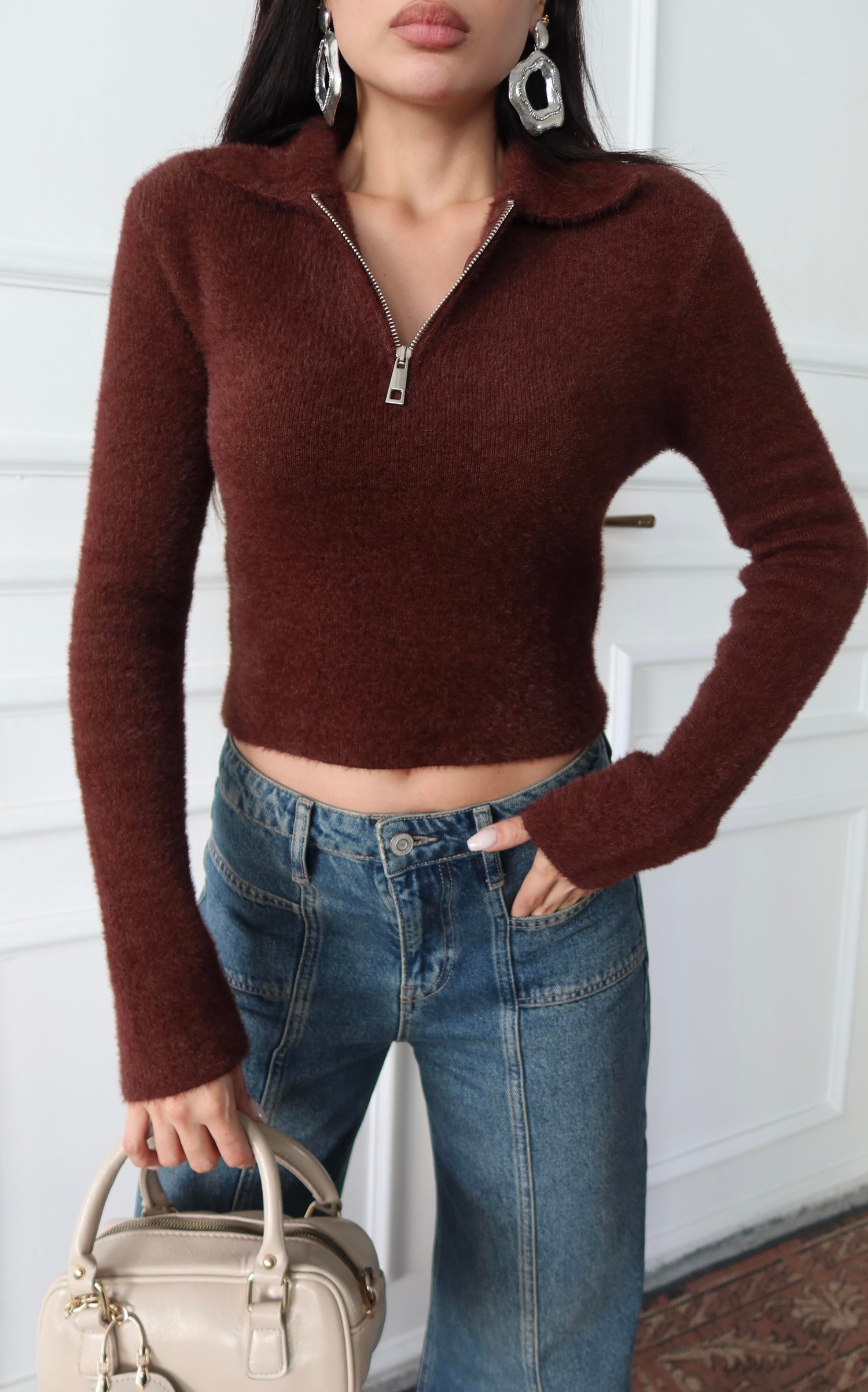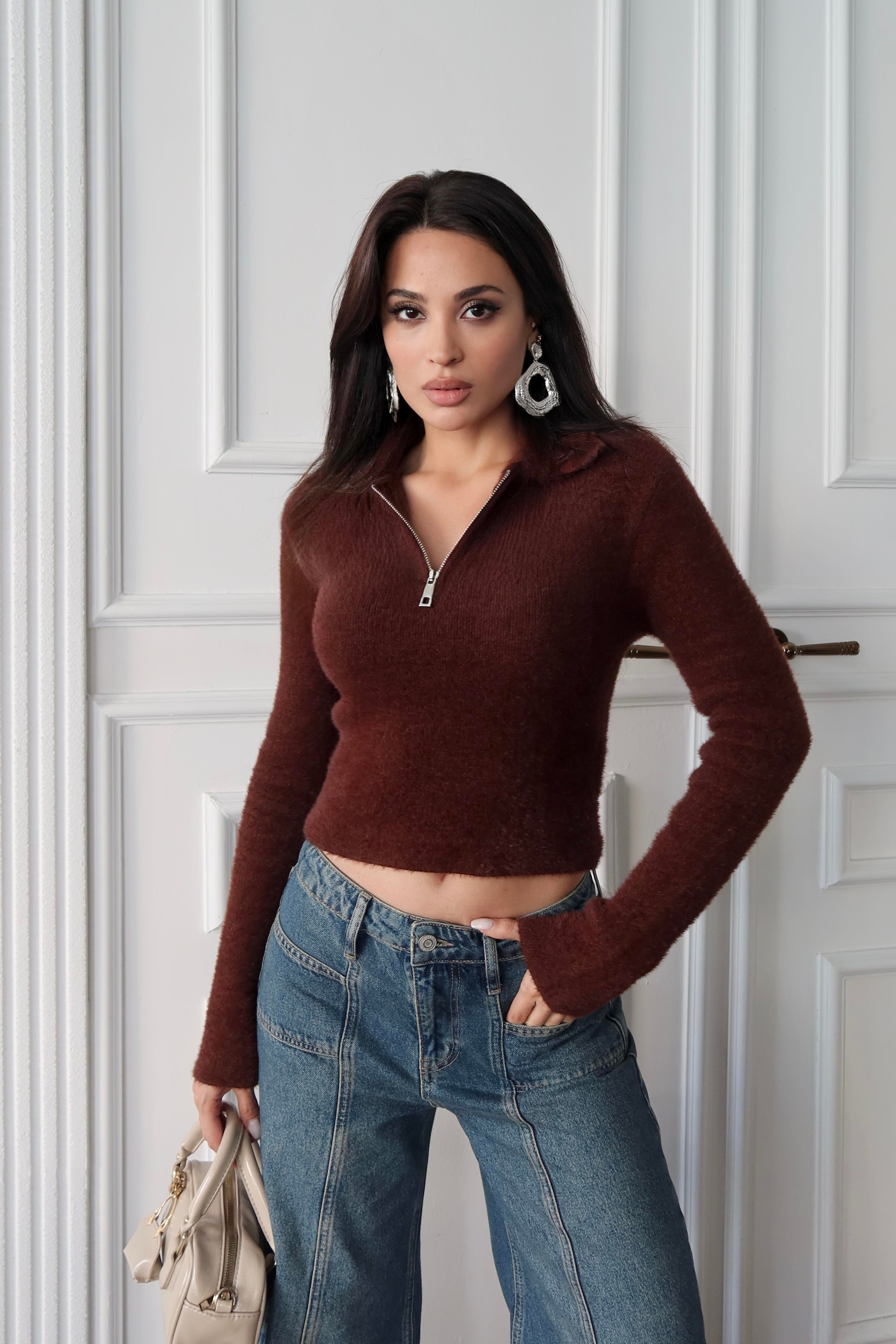 Kahverengi Fermuarlı Yumuşak Dokulu Triko Kazak