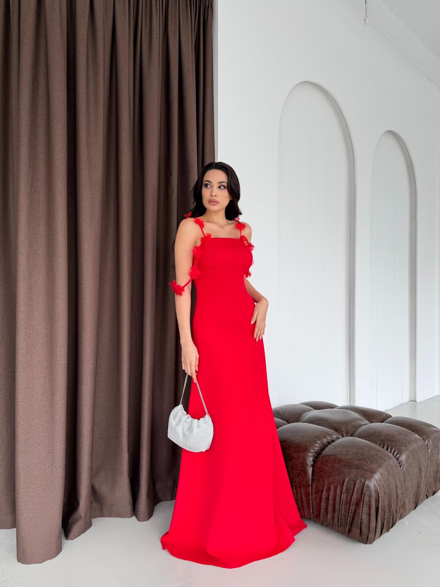 Kırmızı Askısı Çiçek Detaylı Uzun Abiye Elbise