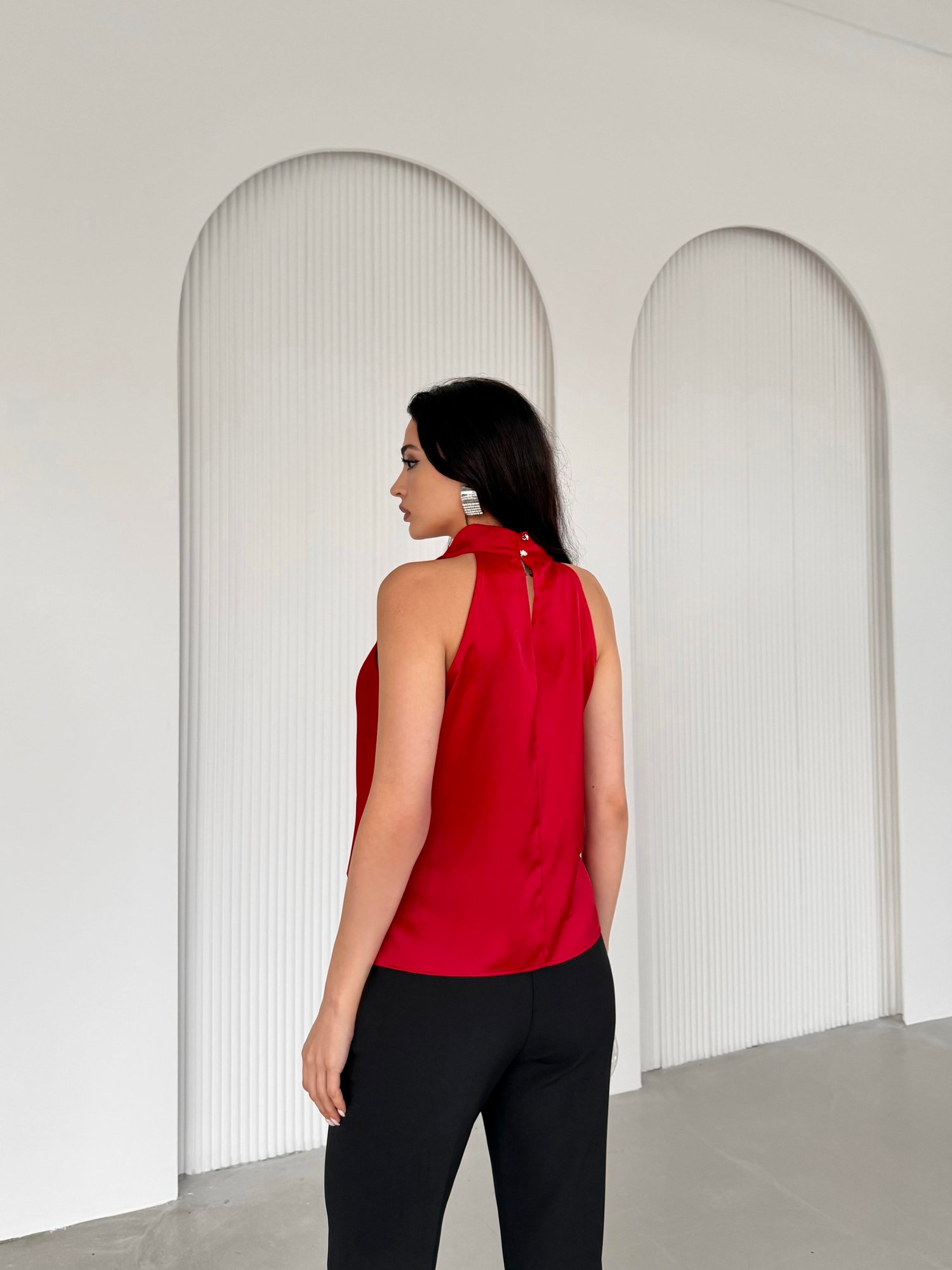 Kırmızı Degaje Yaka Dökümlü Saten Bluz