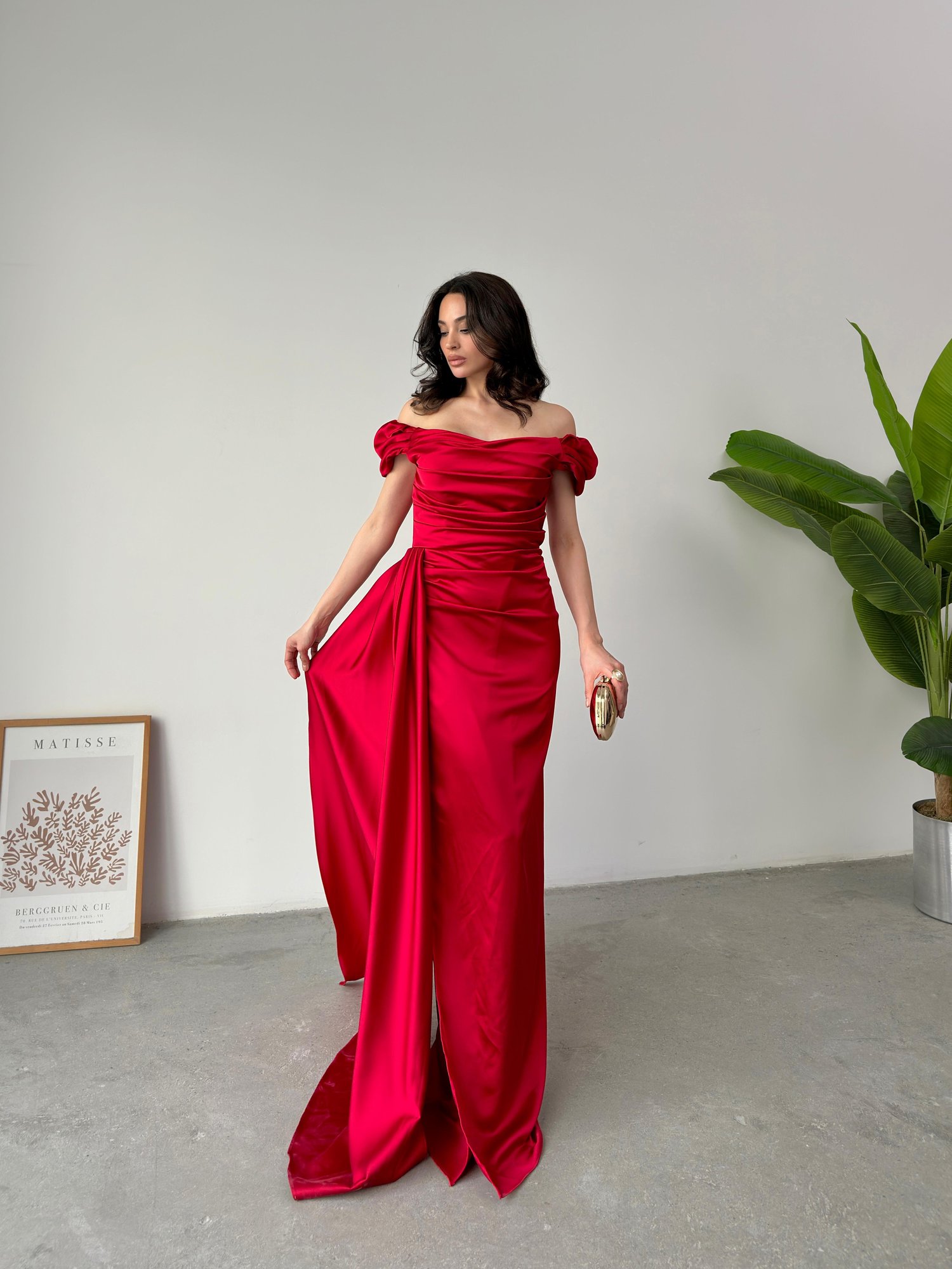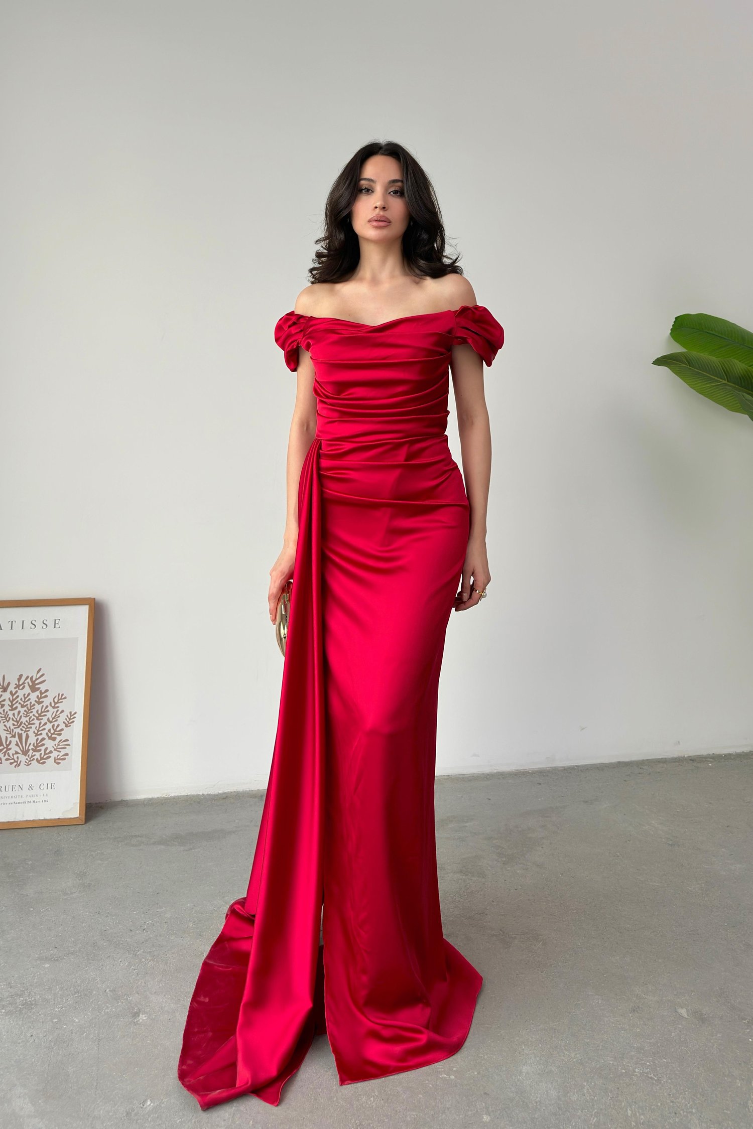 Kırmızı Düşük Omuz Drapeli Abiye Elbise