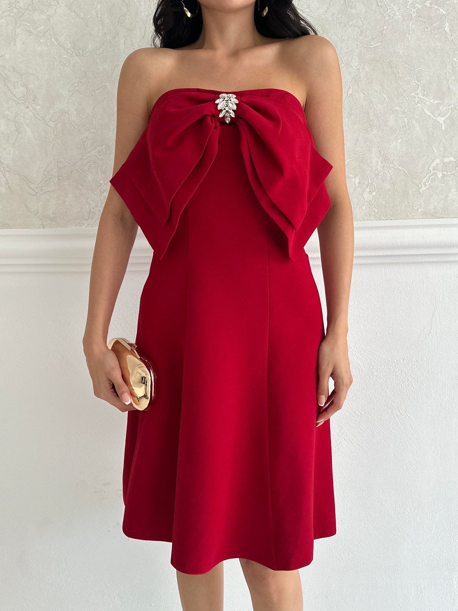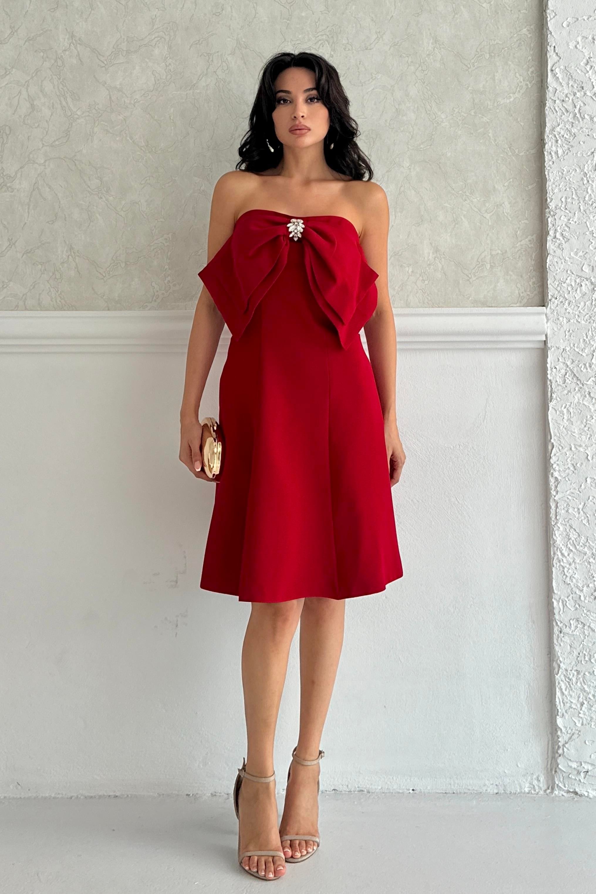 Kırmızı Fiyonk Detaylı Mini Abiye Elbise
