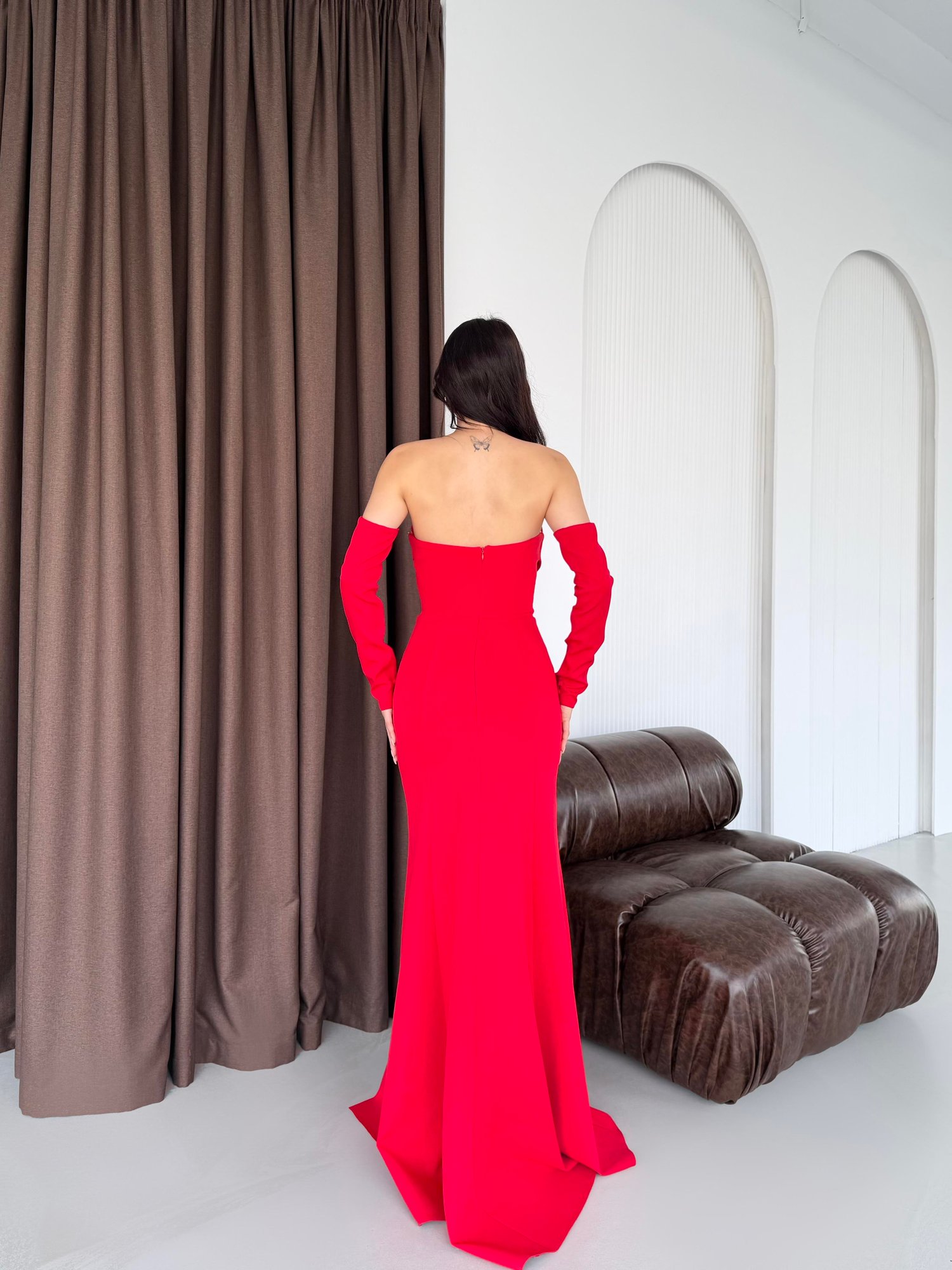 Kırmızı Göğüs Taş Detaylı Balenli Abiye Elbise