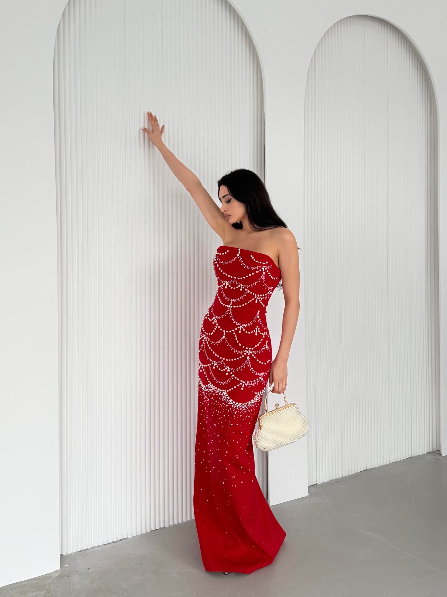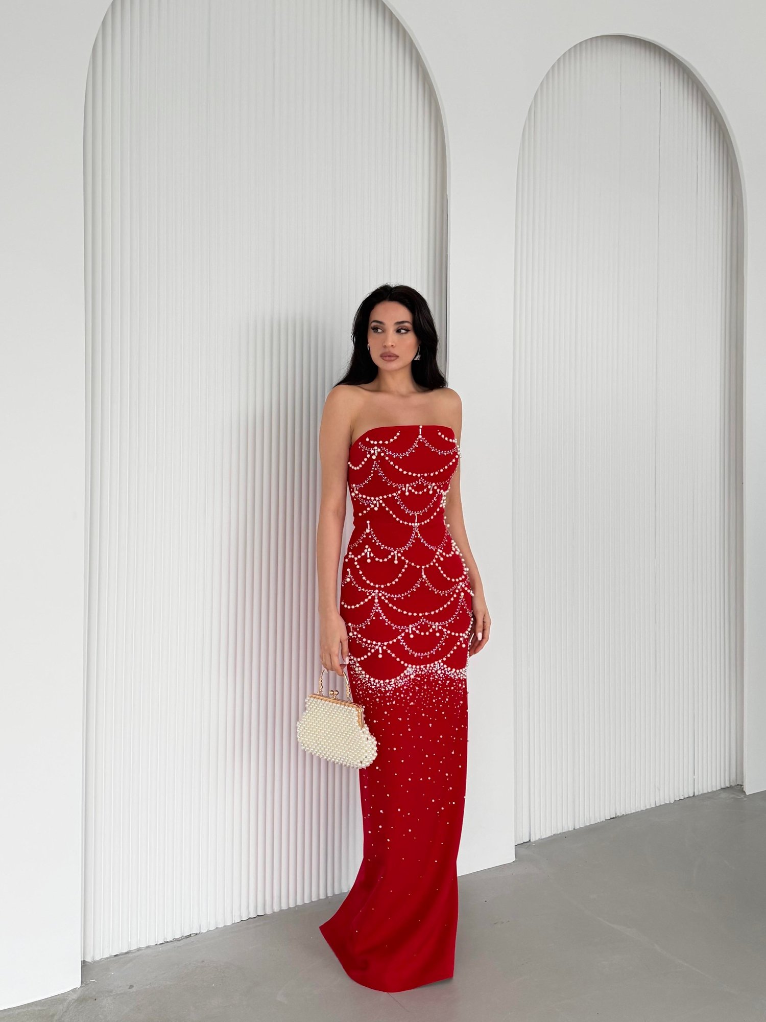 Kırmızı İnci İşlemeli Yırtmaçlı Straplez Kalem Abiye Elbise