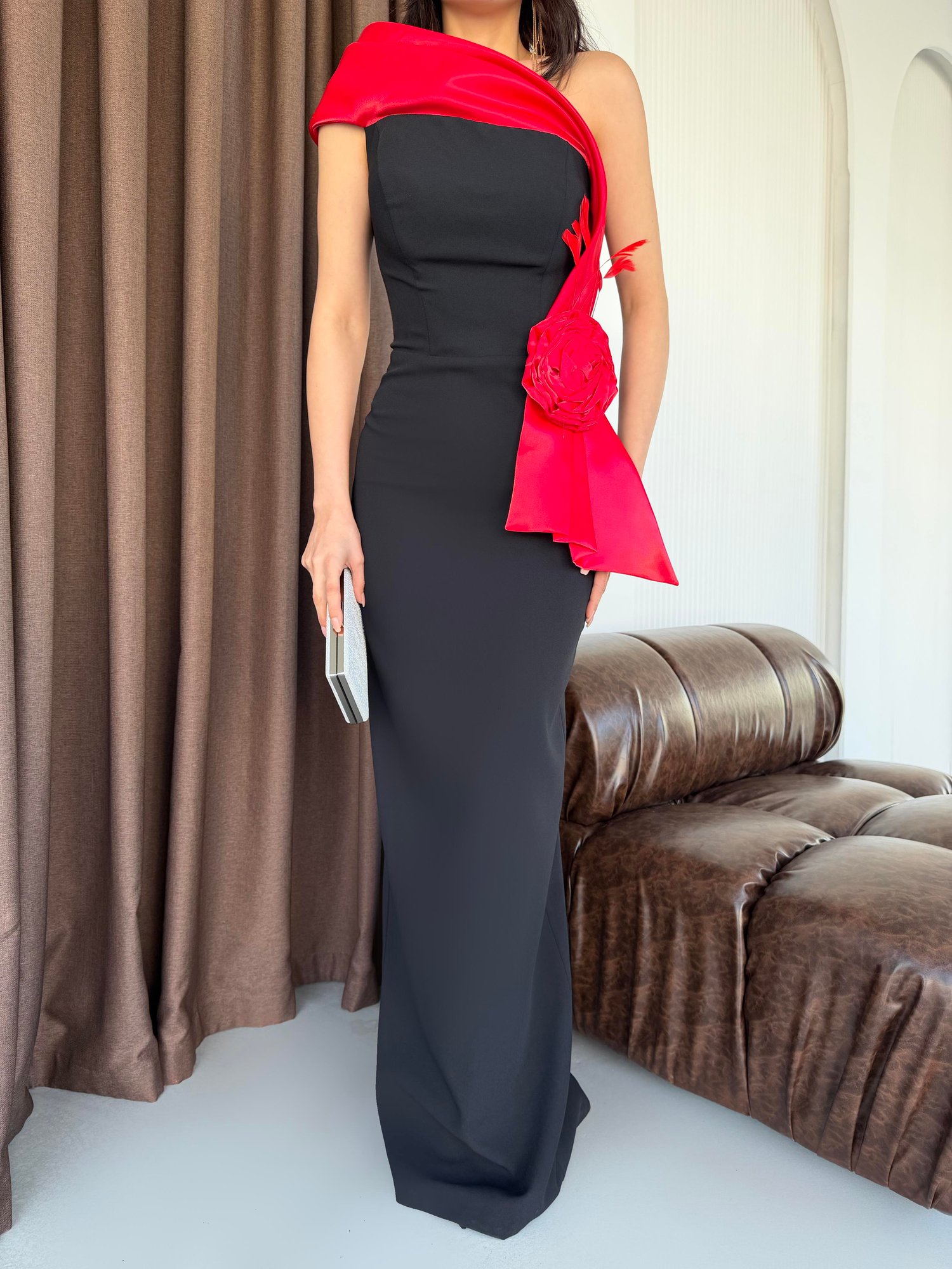 Kırmızı Şeritli Tek Omuz Gül Detaylı Abiye Elbise