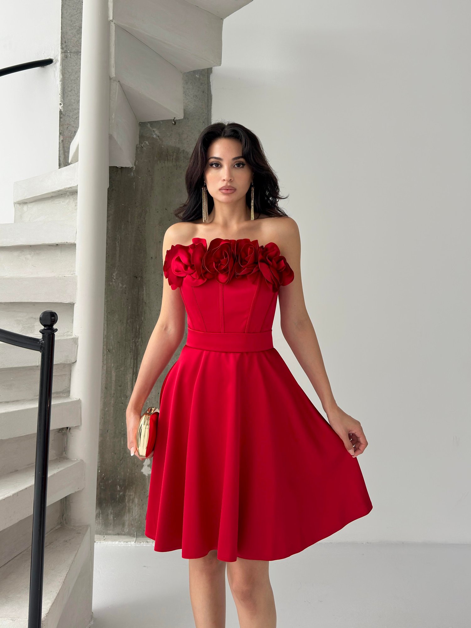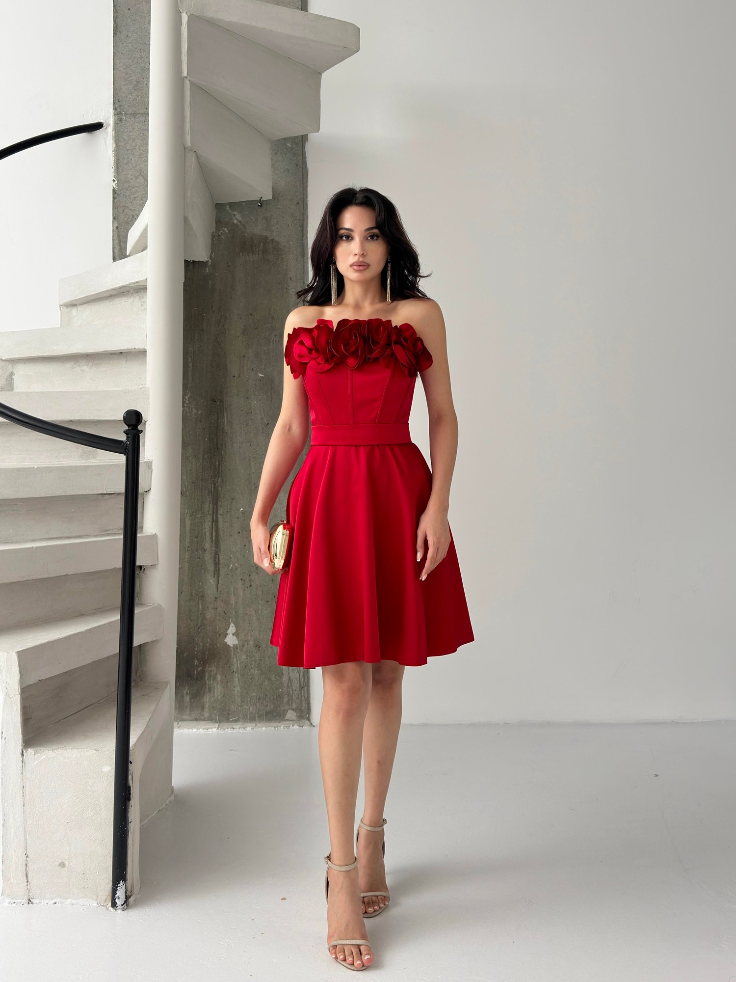 Kırmızı Straplez Mini Saten Abiye Elbise