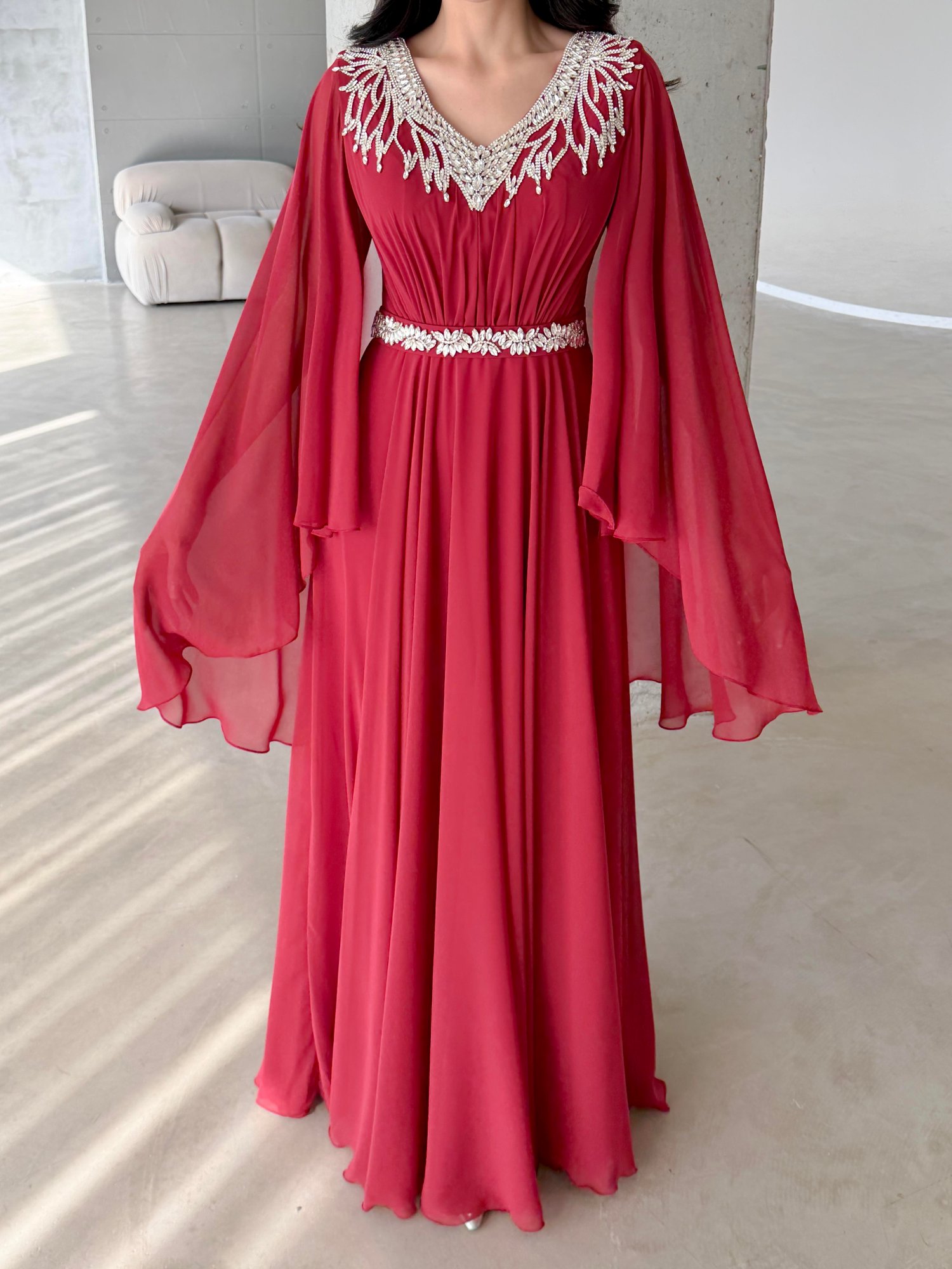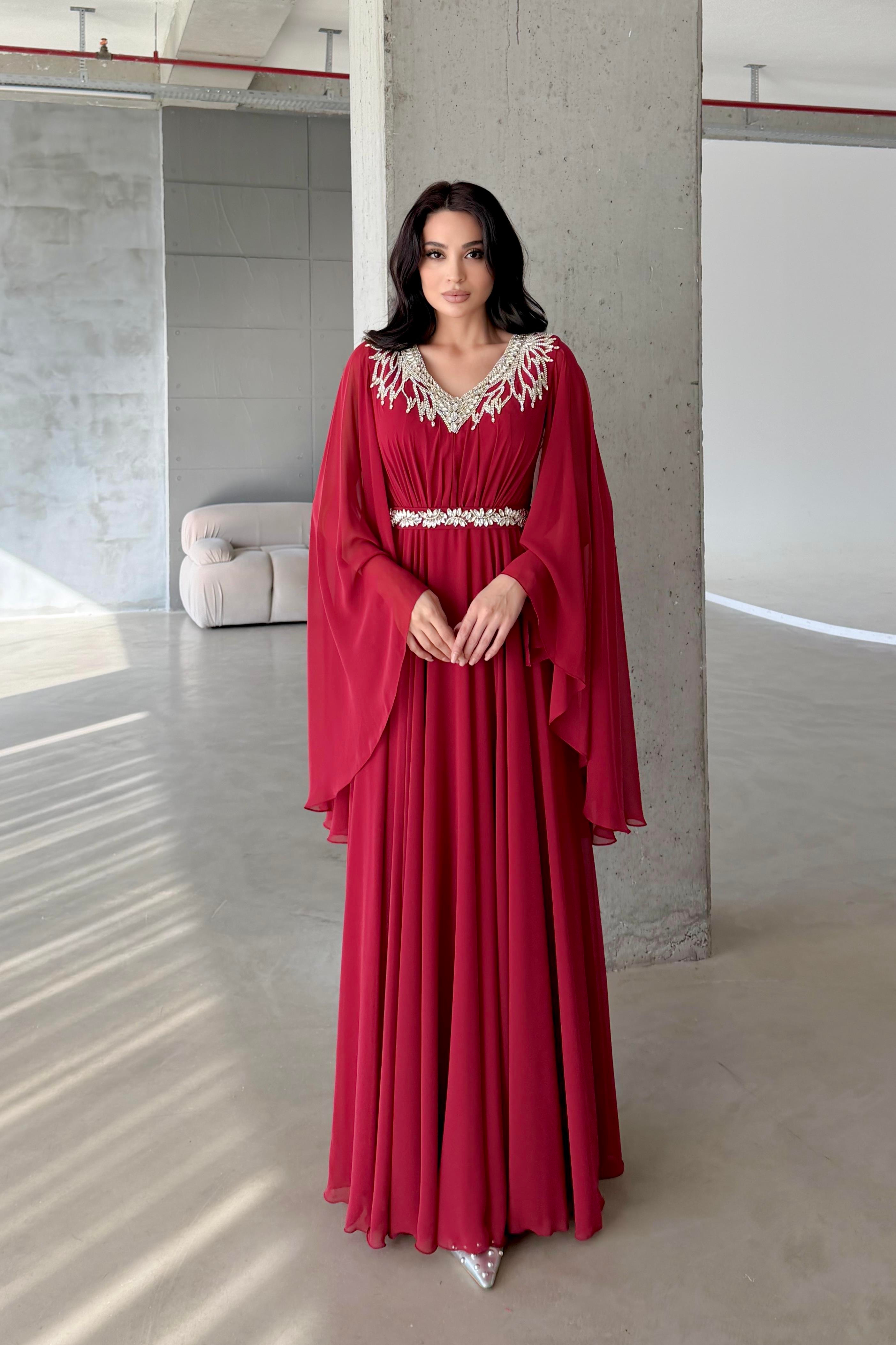 Kırmızı Taş İşlemeli Tül Pelerinli Abiye Elbise