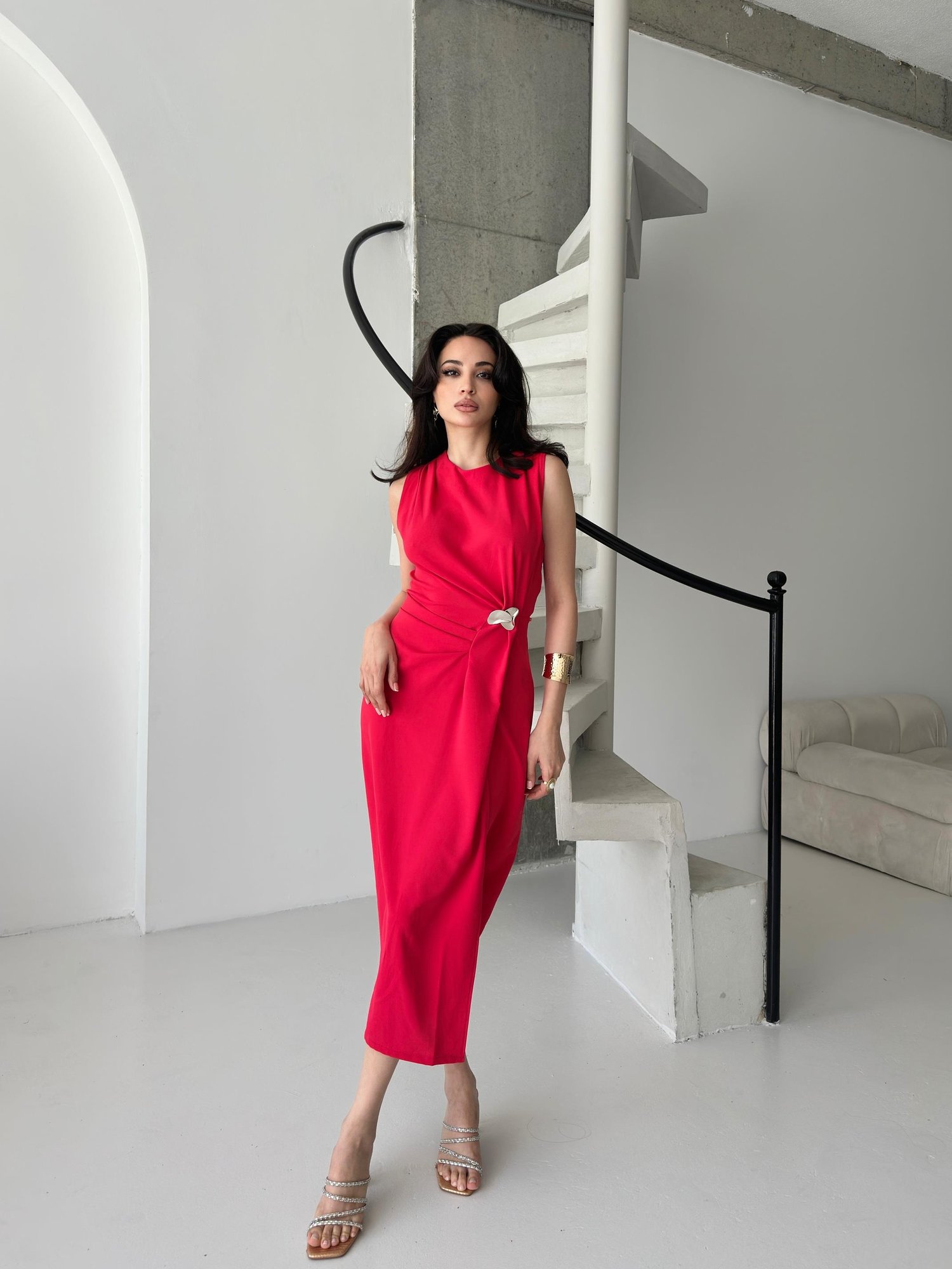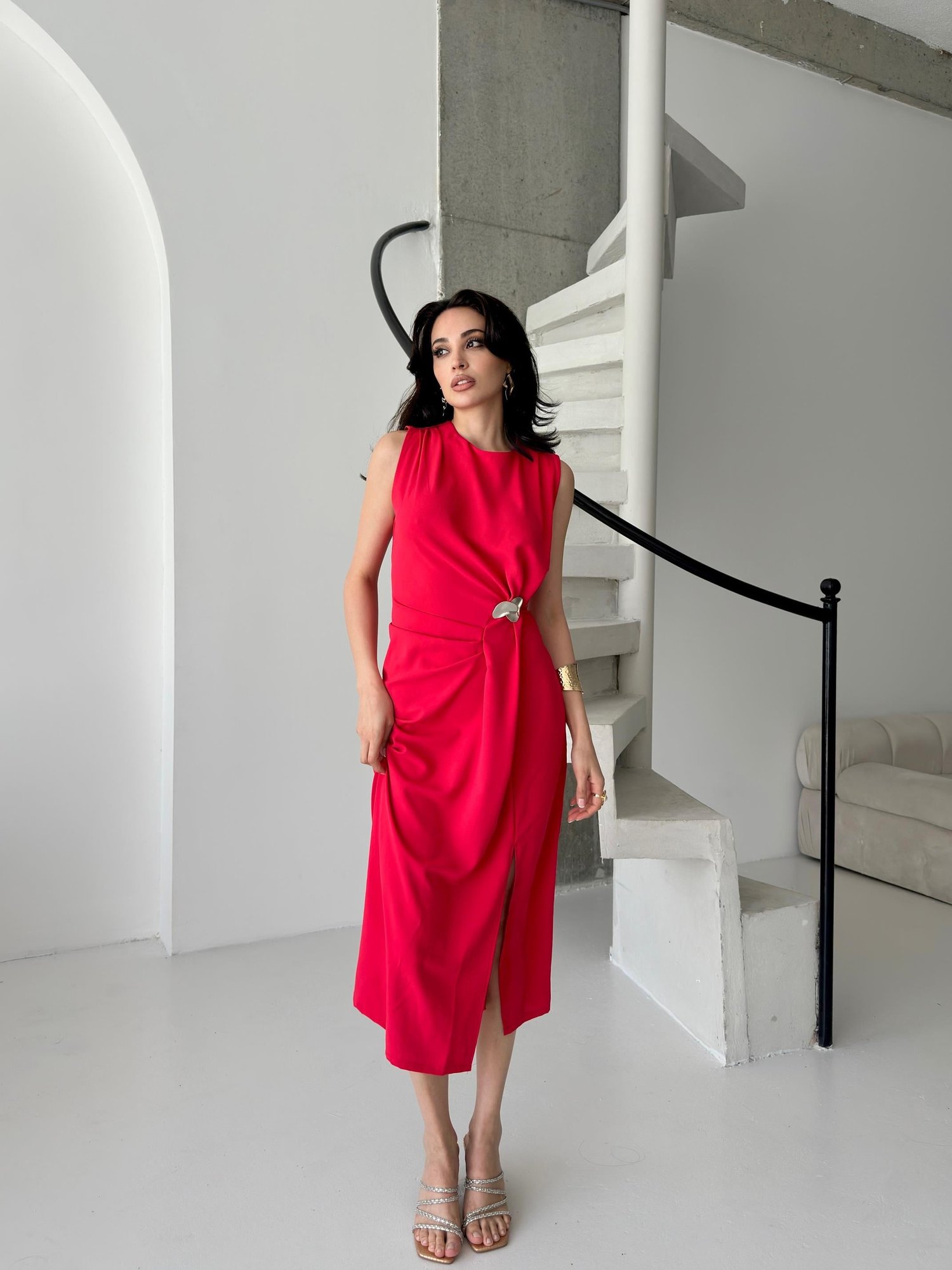 Kırmızı Tokalı Pile Detaylı Kolsuz Elbise