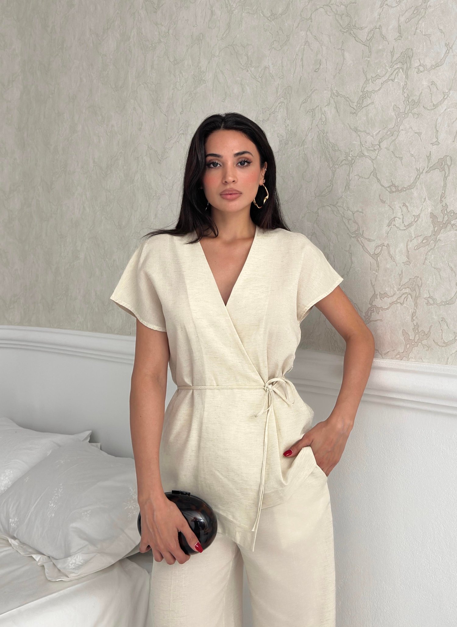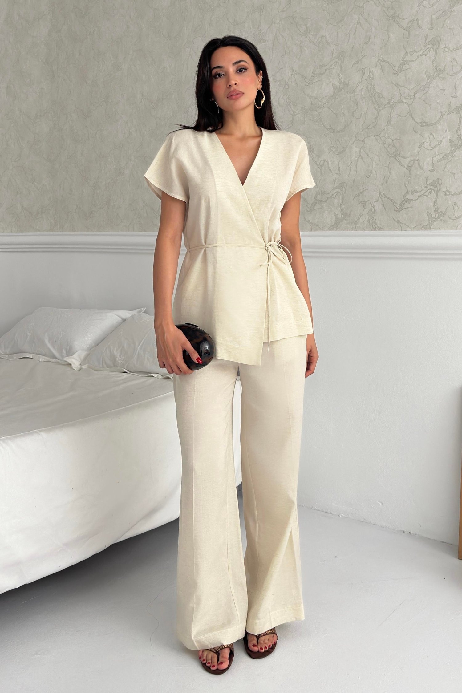 Krem Kruvaze Bluz  İspanyol Paça Pantolon Takım
