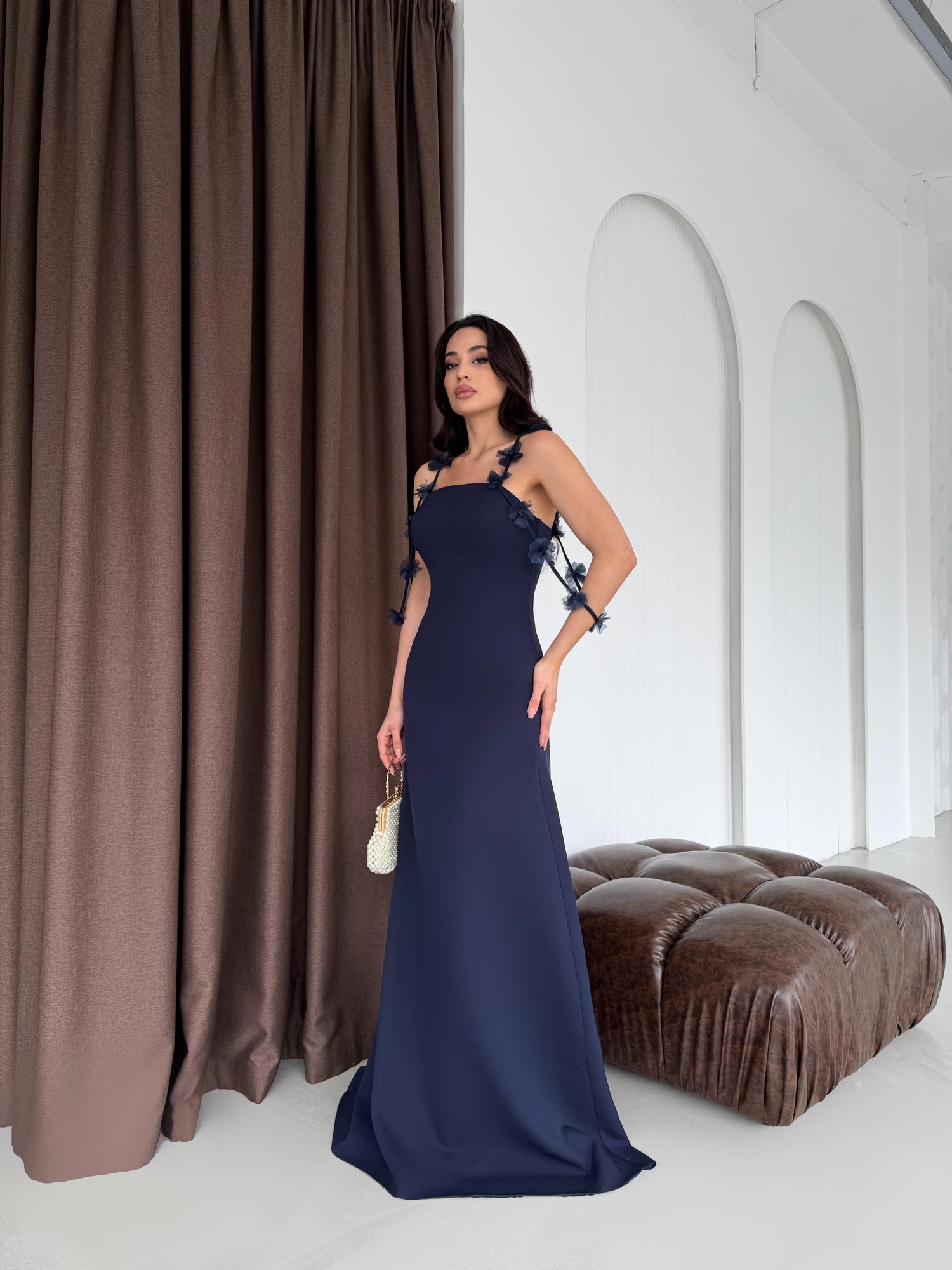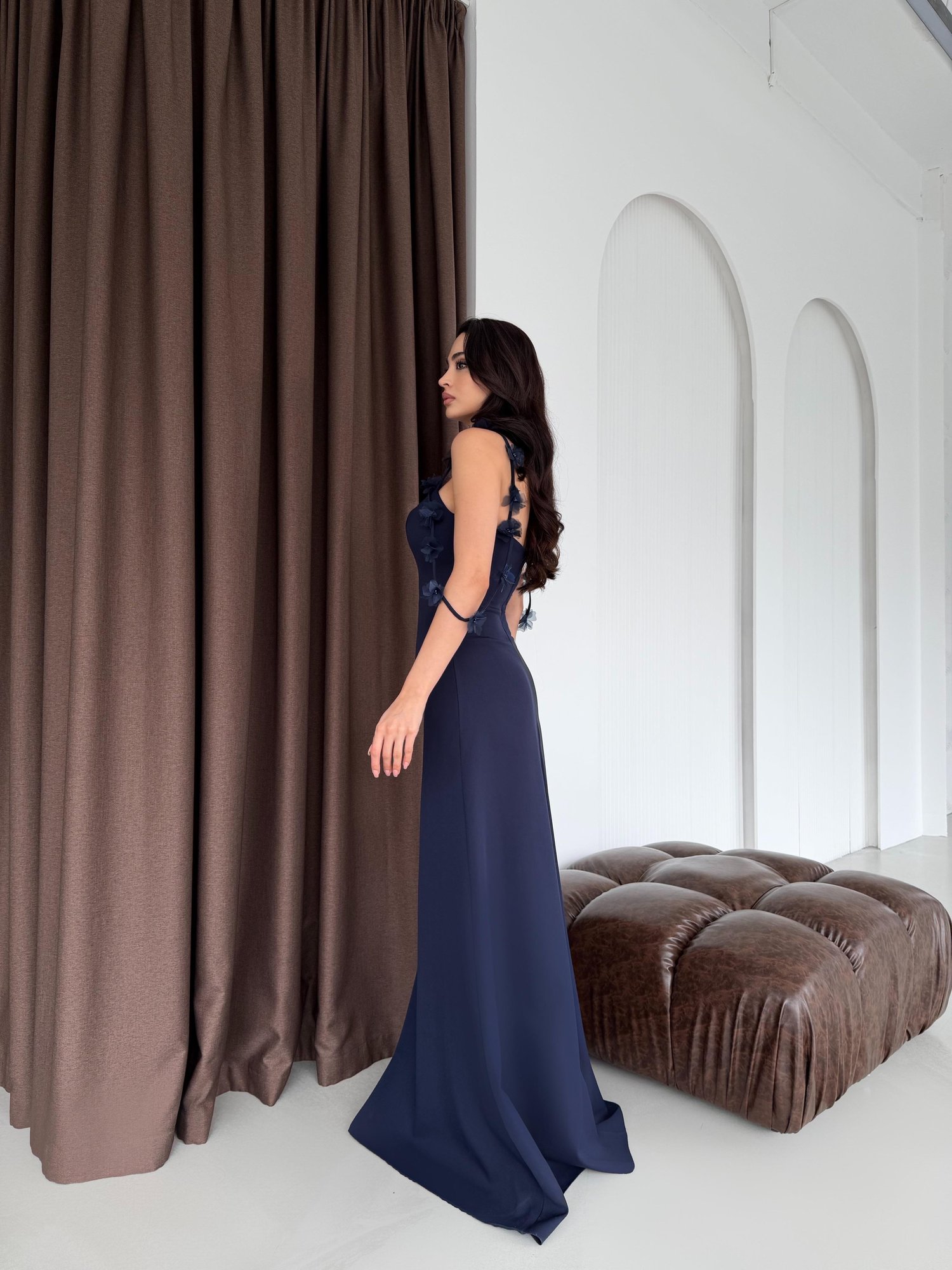 Lacivert Askısı Çiçek Detaylı Uzun Abiye Elbise