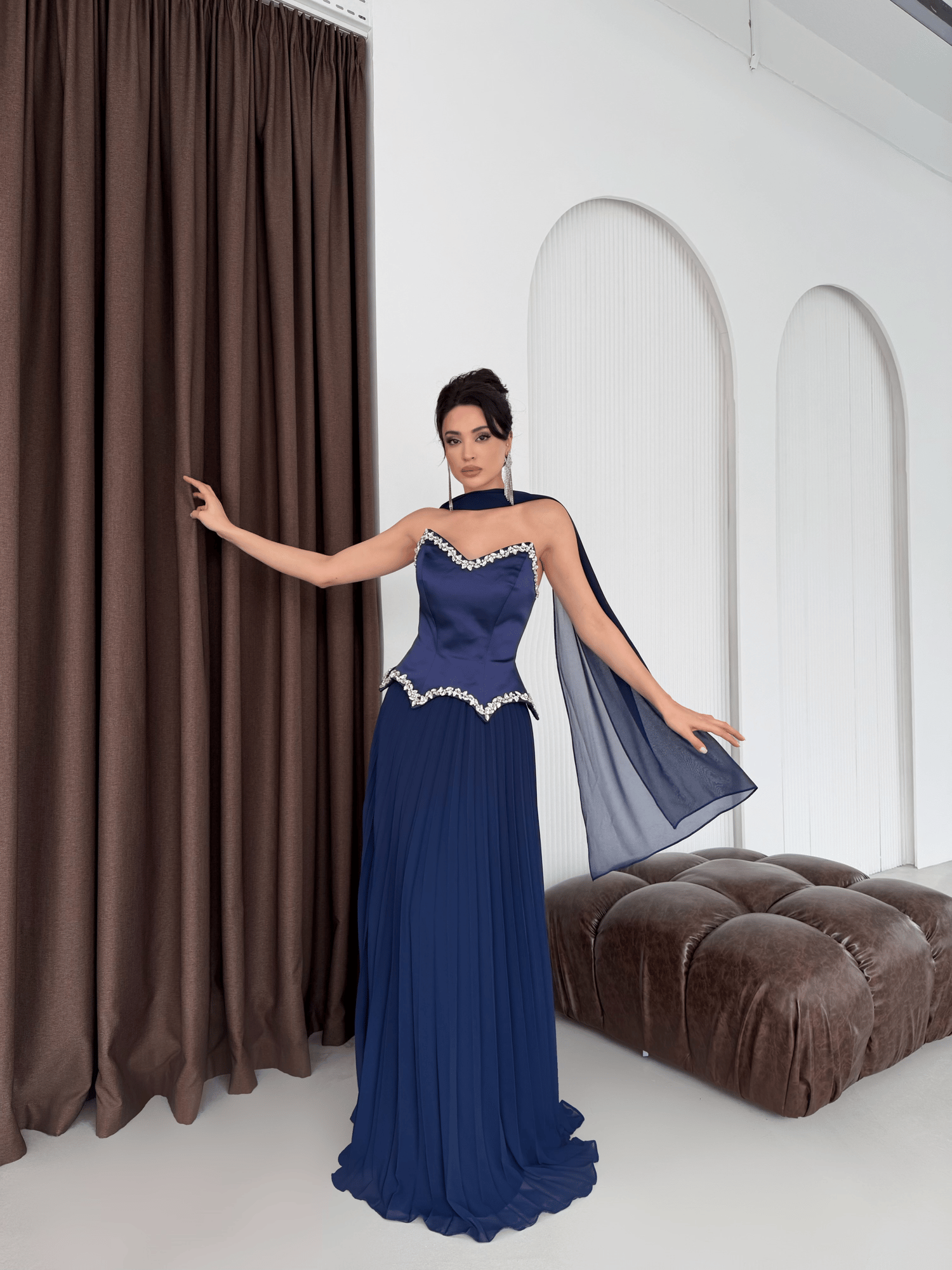Lacivert Kalp Yaka Taş İşlemeli Şal Detaylı Eteği Pileli Abiye Elbise