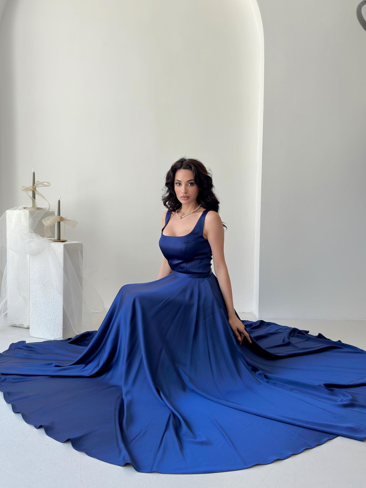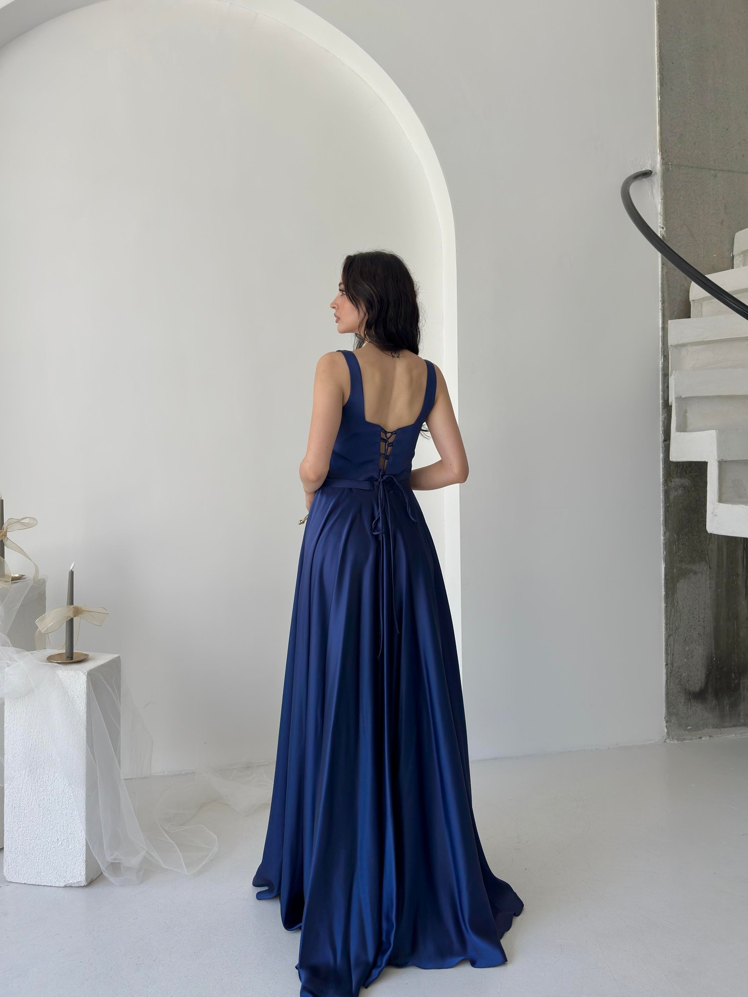 Lacivert Kare Yaka Askılı Saten Abiye Elbise
