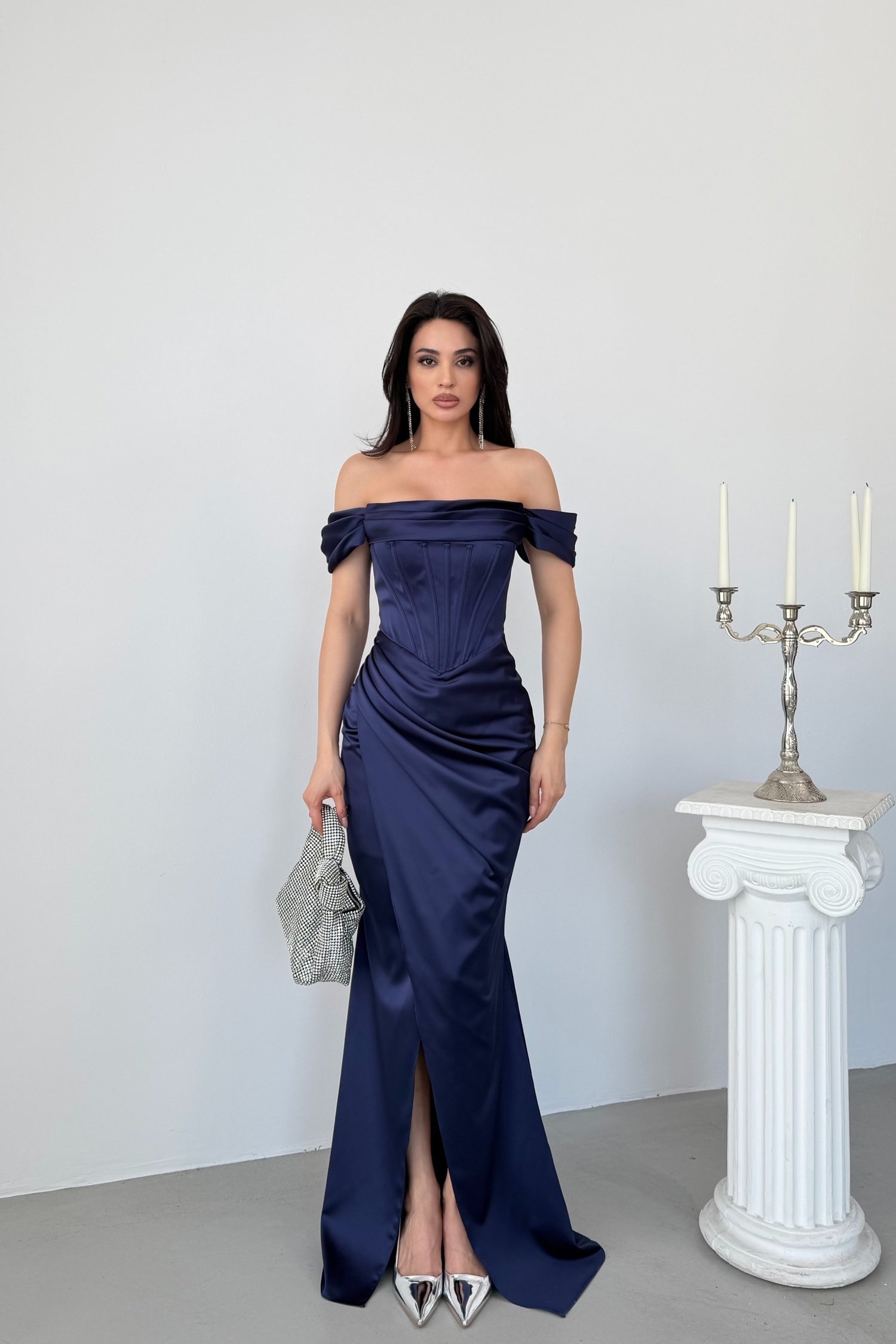 Lacivert Kayık Yaka Yırtmaçlı Uzun Saten Abiye Elbise