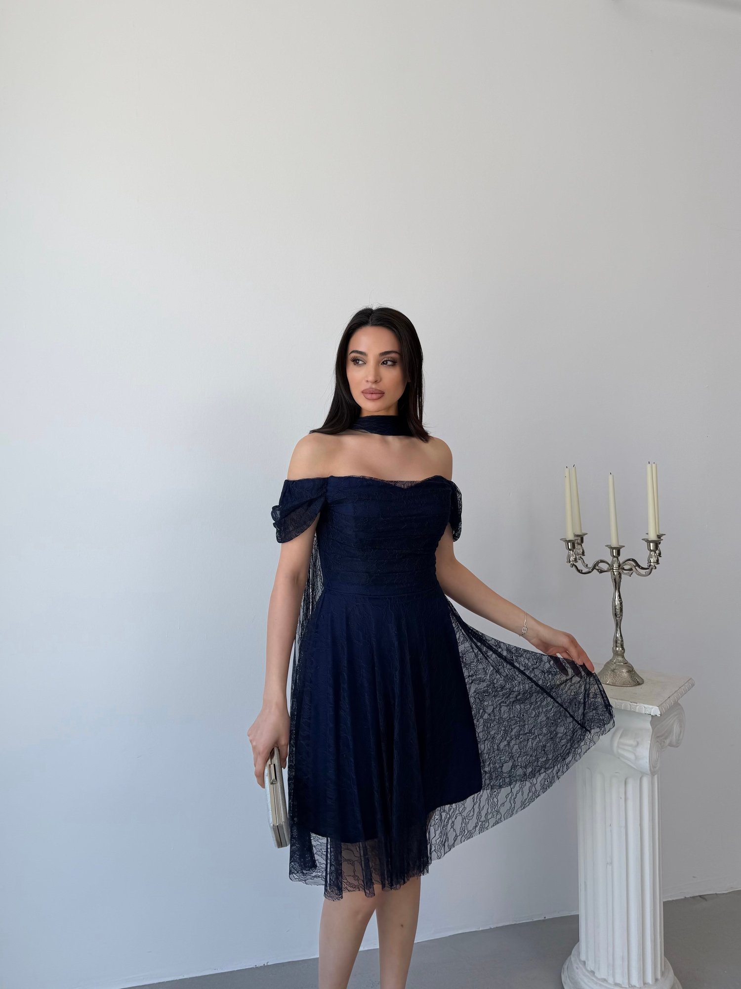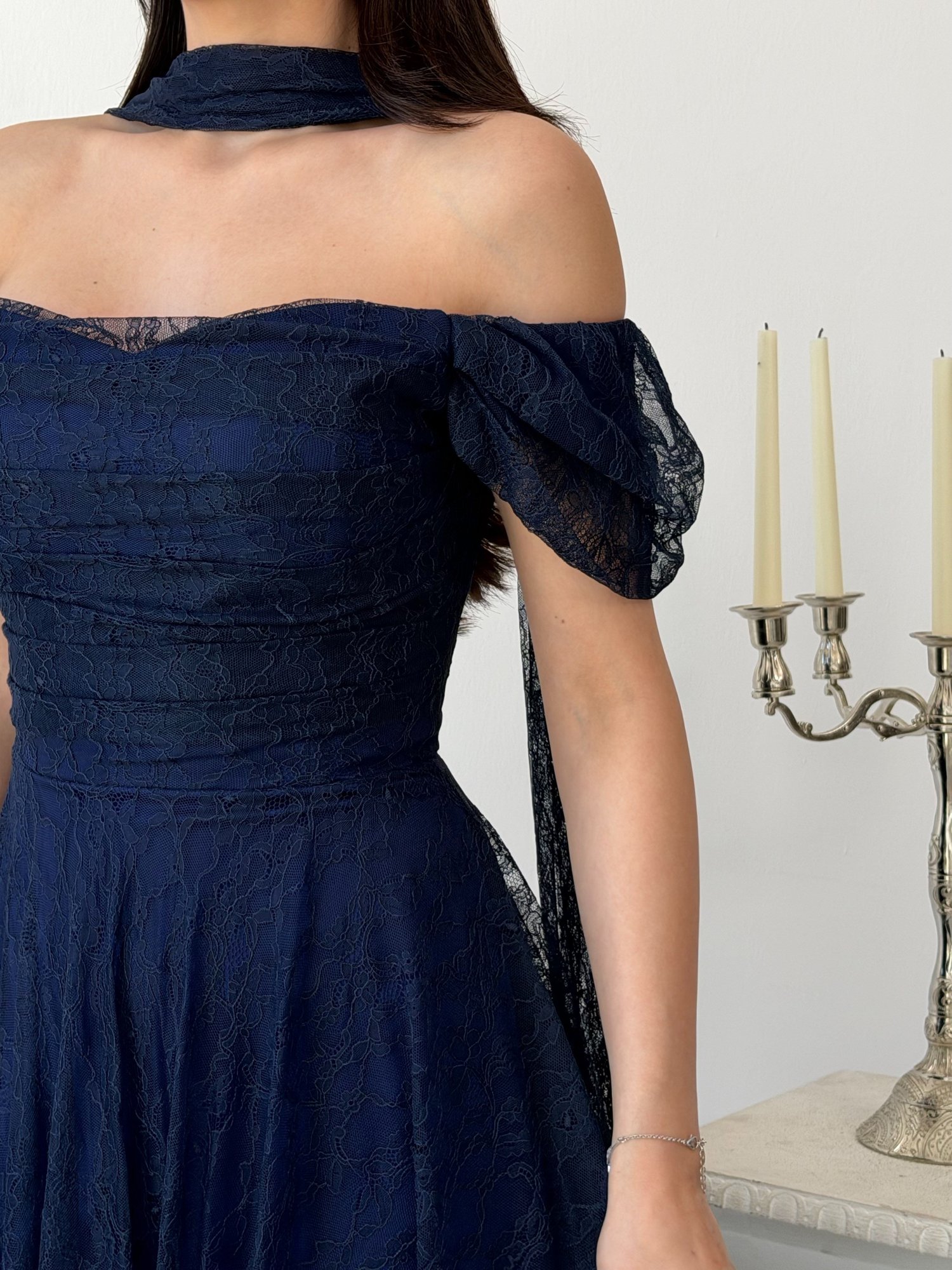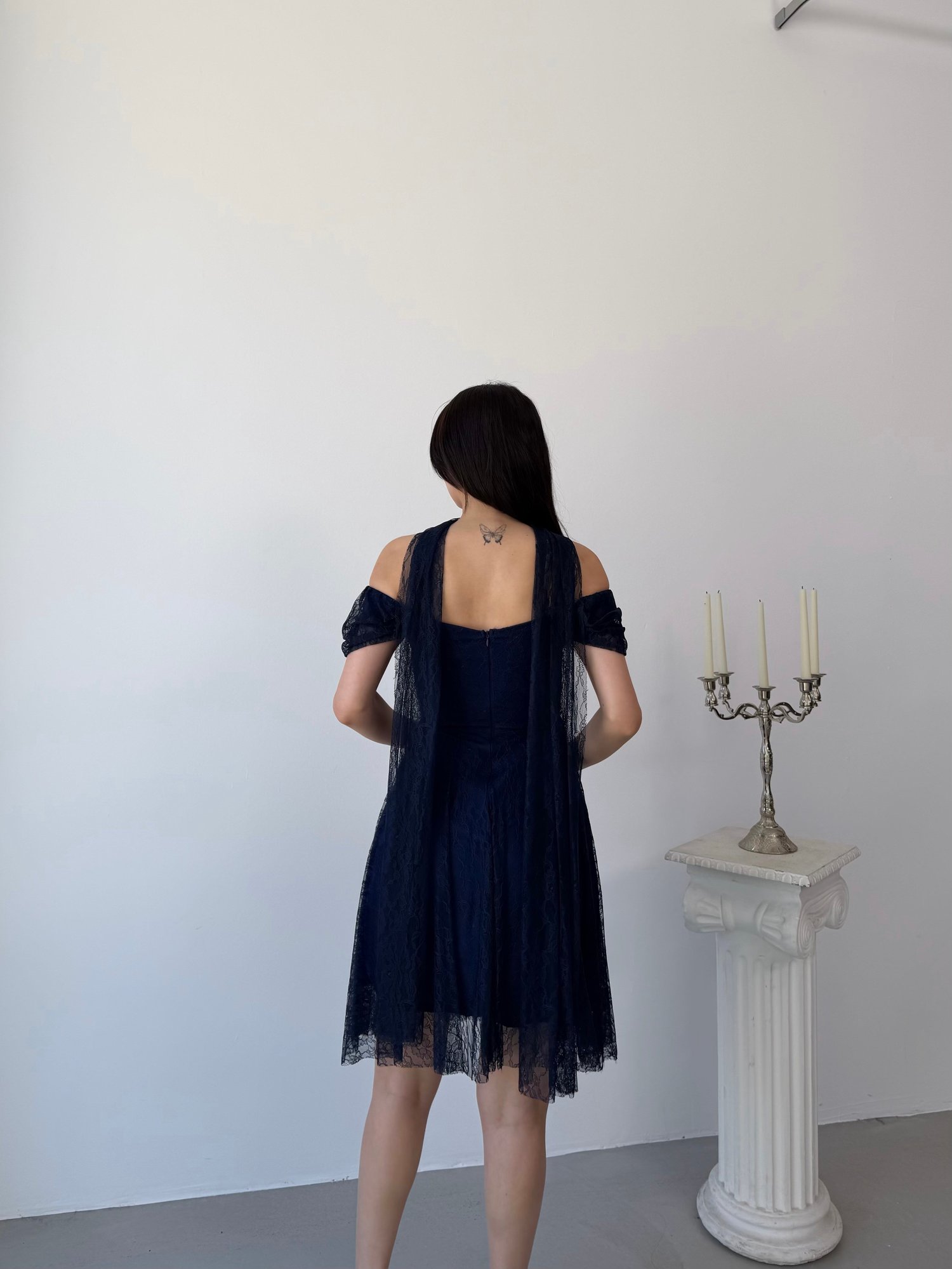 Lacivert Omuz Fular Detaylı Dantel Kumaş Kısa Abiye Elbise