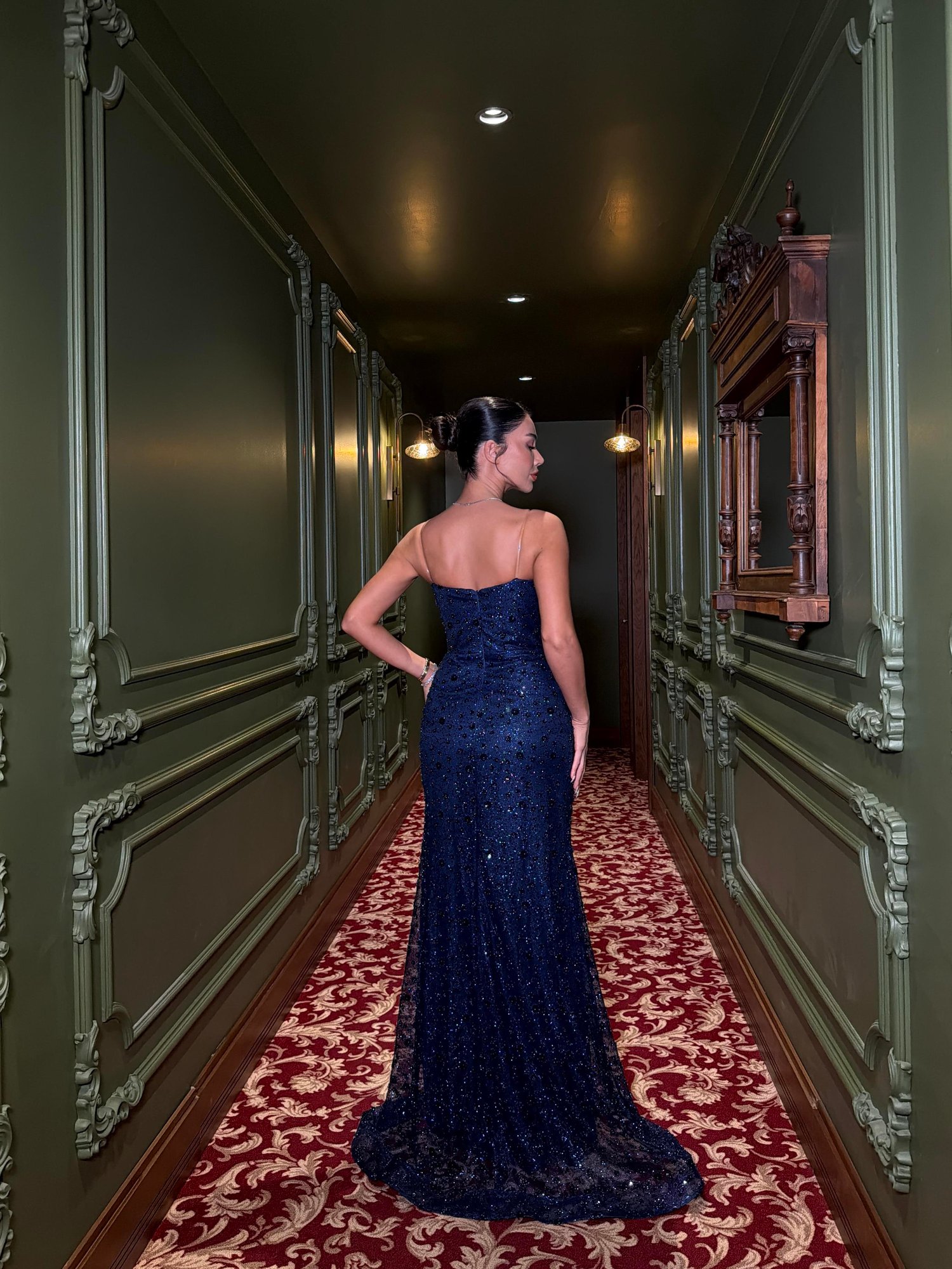 Lacivert Pul Payetli Straplez Balık Abiye Elbise