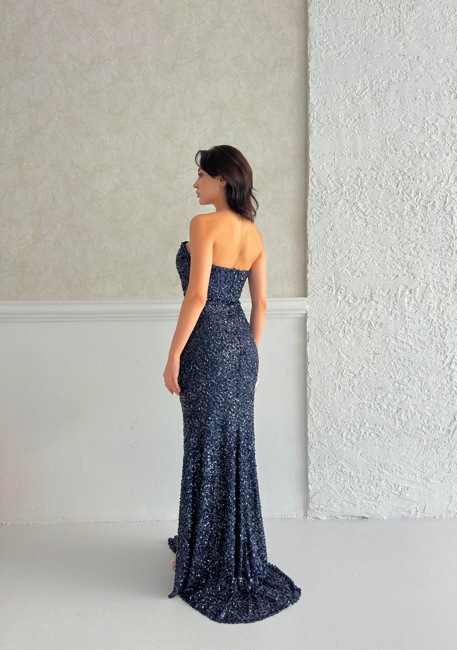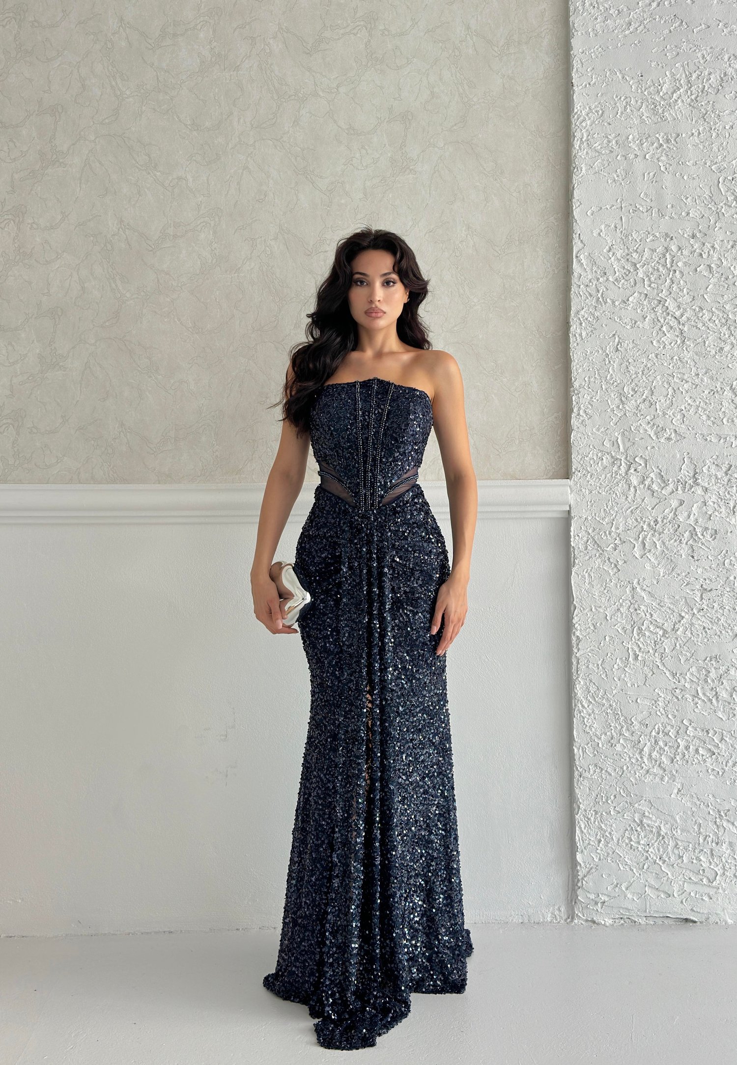 Lacivert Straplez Bel Detaylı Pul Payet Abiye Elbise