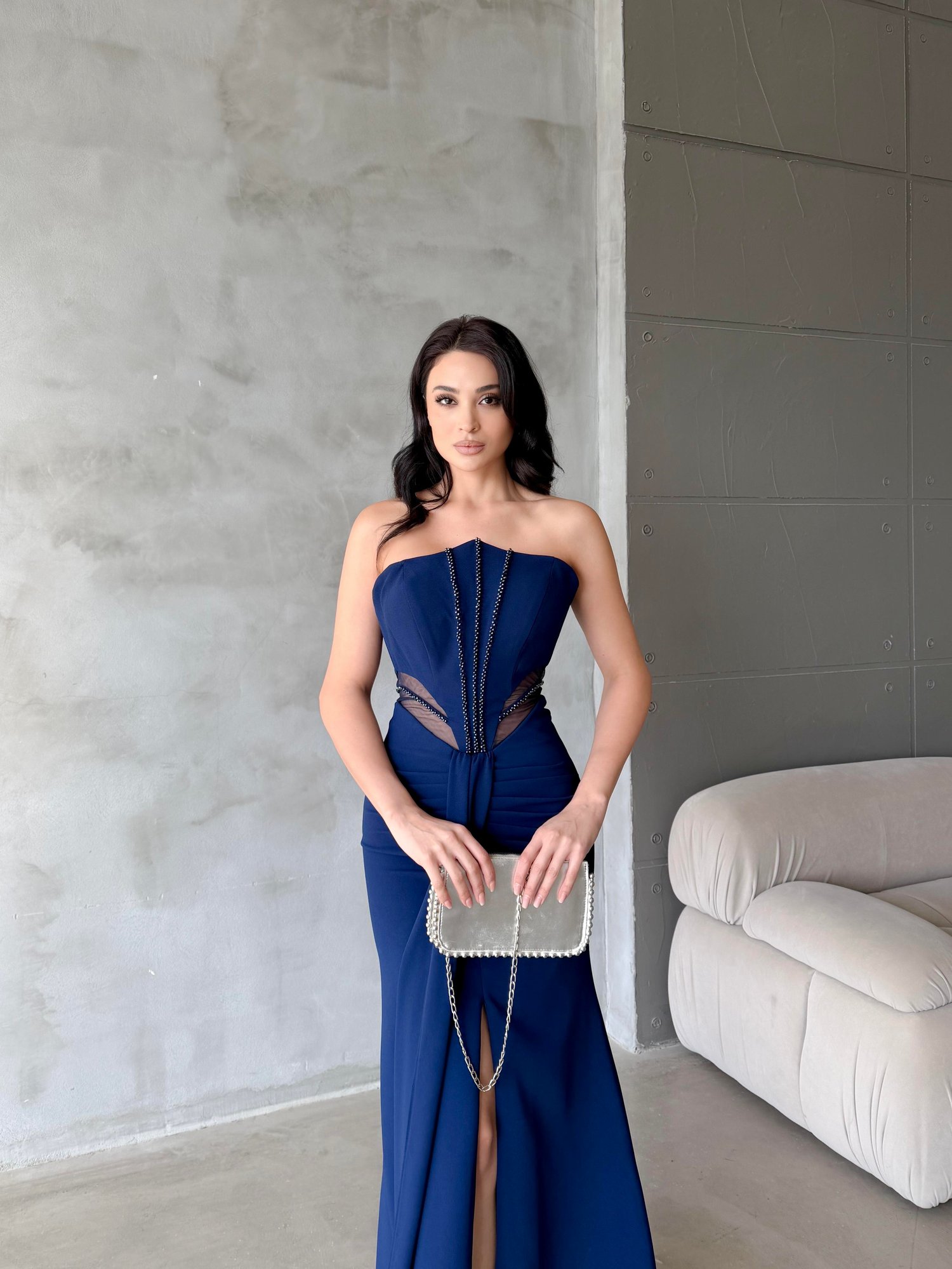 Lacivert Straplez Transparan Bel Detaylı Taşlı Yırtmaçlı Abiye Elbise