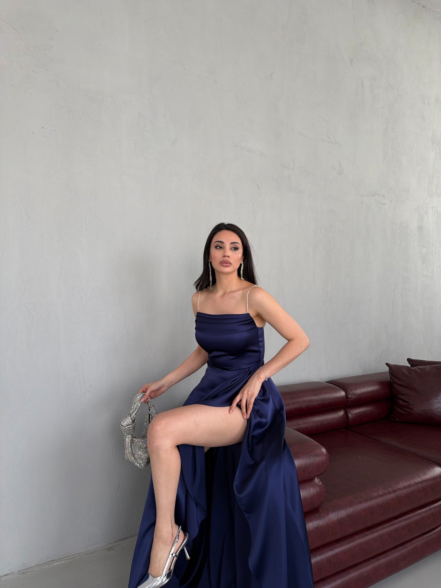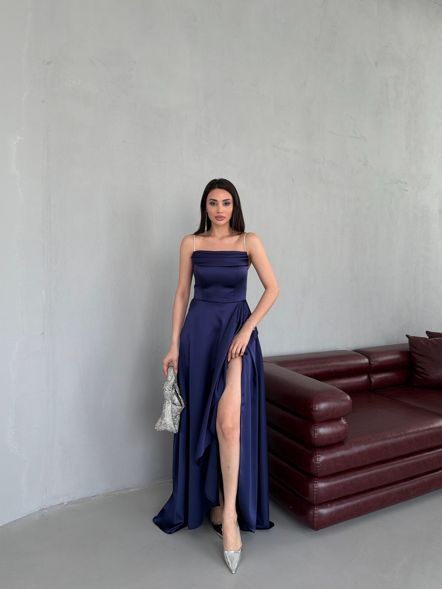 Zamansız şıklığı modern detaylarla buluşturan bu uzun abiye elbise, sade ve güçlü bir siluet sunar. İnce askılı ve düz kesim yaka detayı üst bedeni zarif bir şekilde vurgularken, belden itibaren dökülen asimetrik katmanlı etek tasarımı elbiseye hareket ve sofistike bir hava katar. Akışkan formu sayesinde yürüdükçe zarif bir dalga etkisi yaratarak dikkat çekici bir görünüm sağlar. Minimal ama etkileyici bir stil arayanlar için ideal bir parçadır.