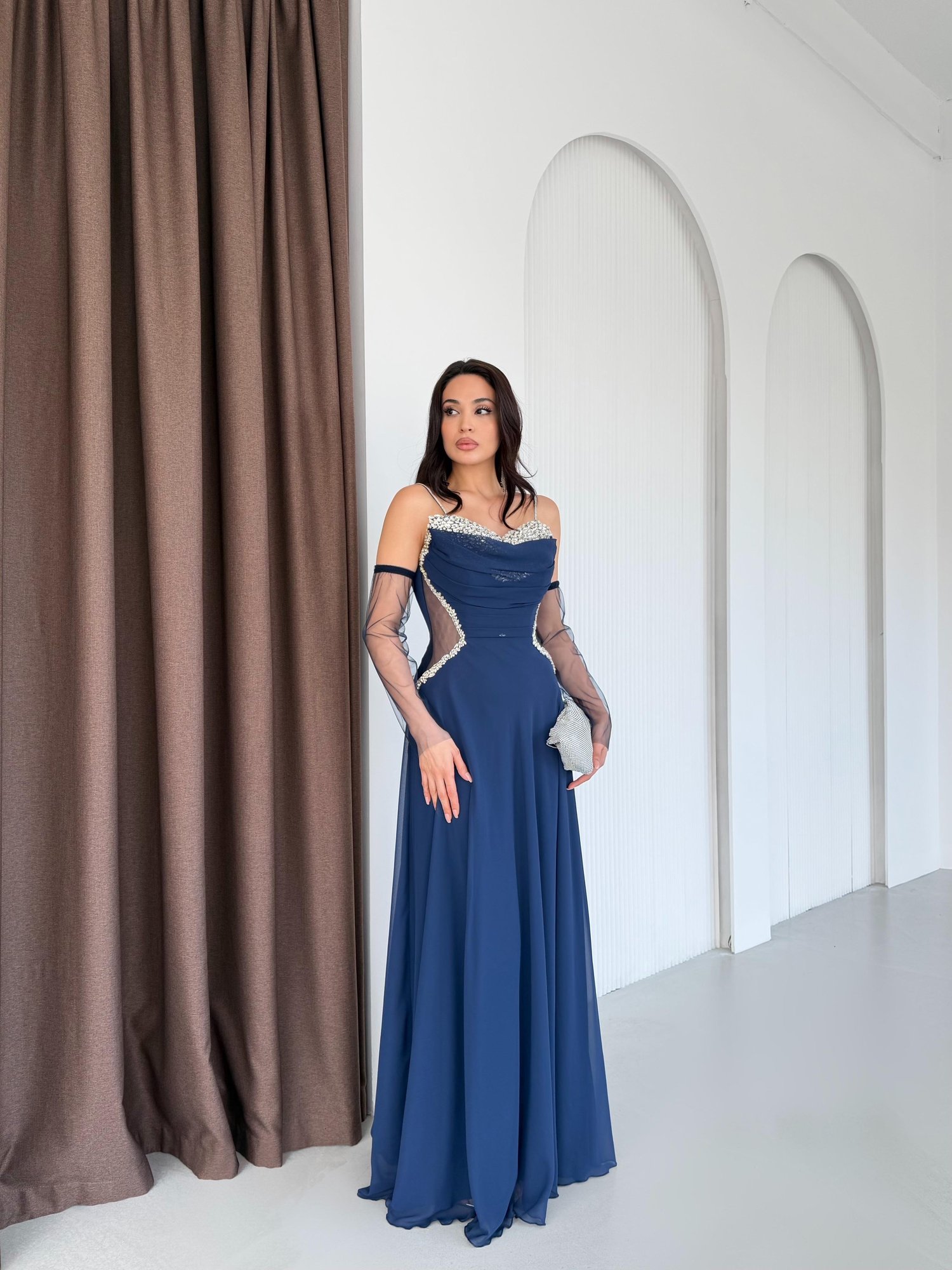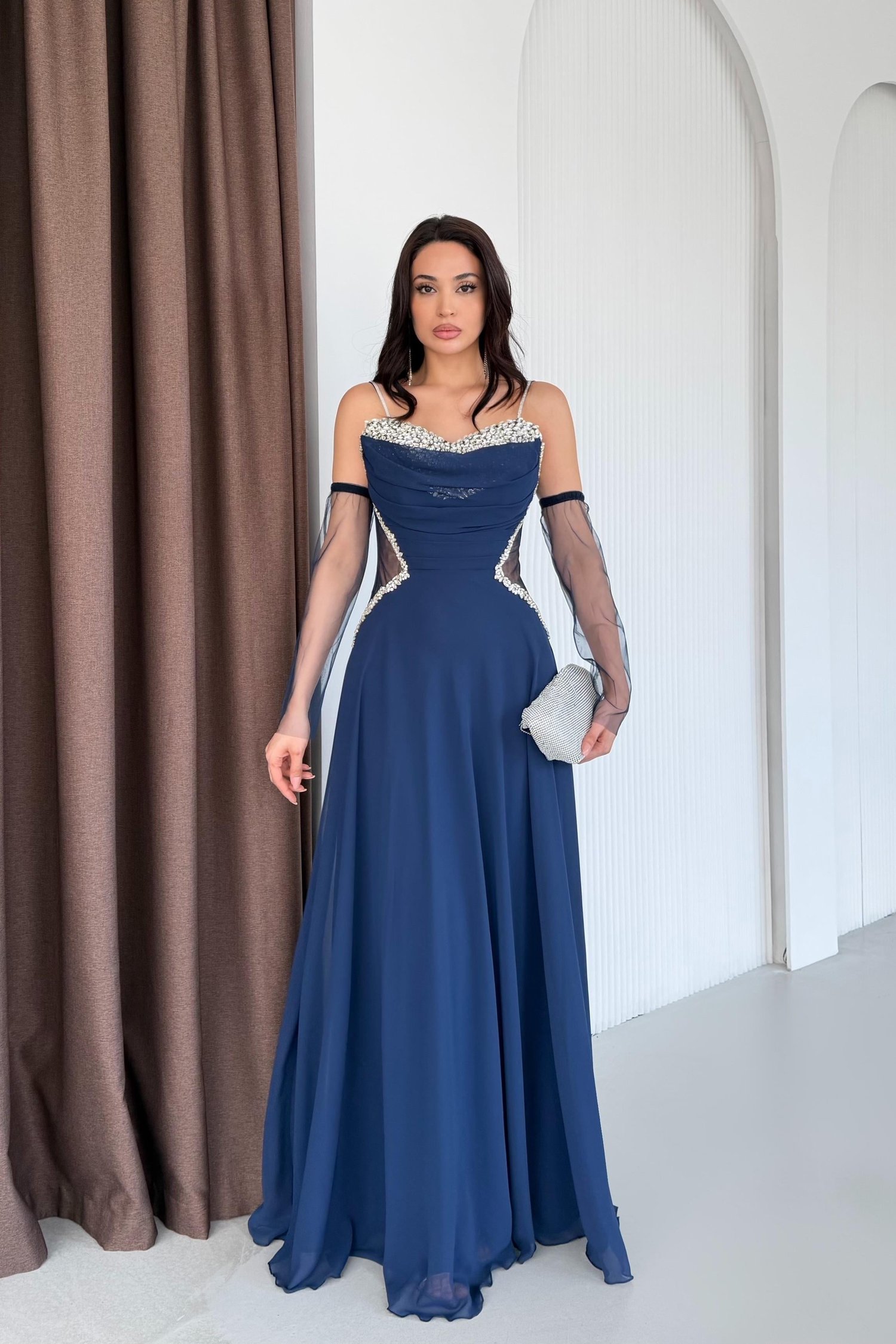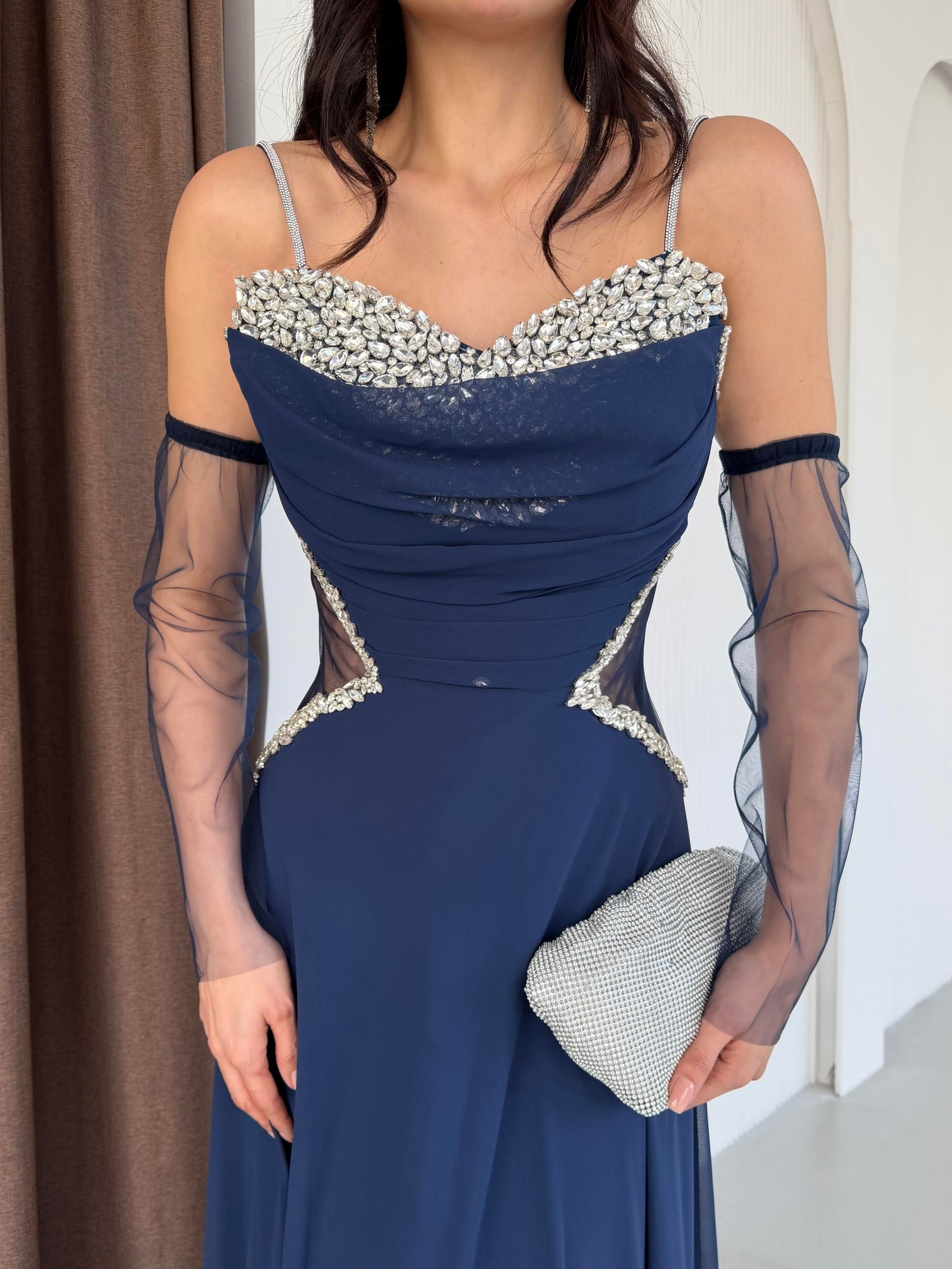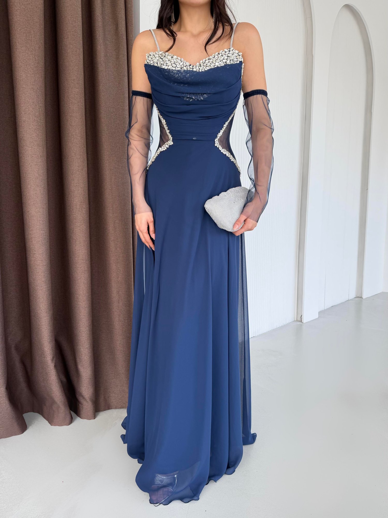 Lacivert Taş İşlemeli Tül Kollu Bel Detaylı Abiye Elbise