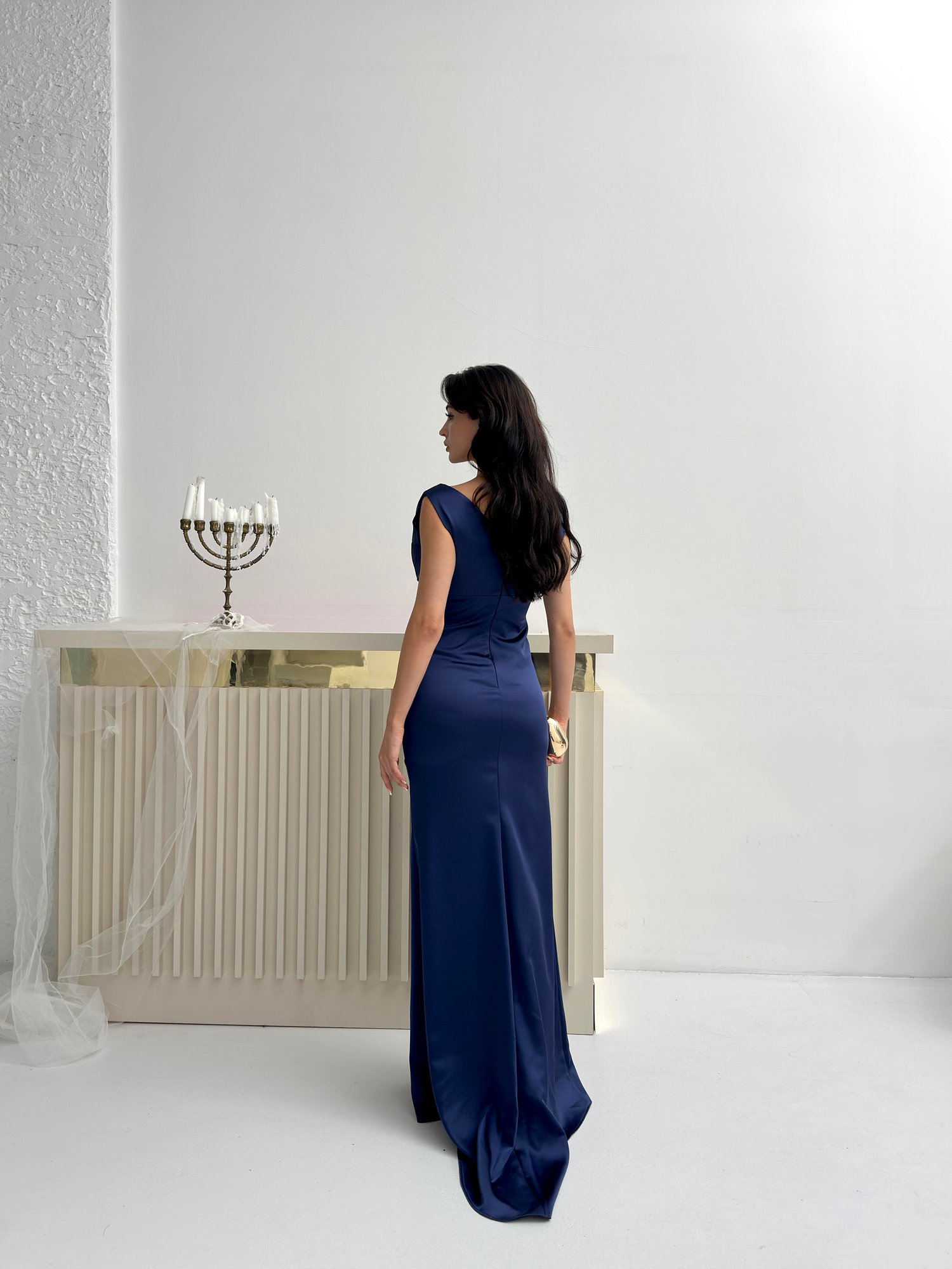 Lacivert V Yaka Drapeli Yaka Drapeli Saten Abiye Elbise