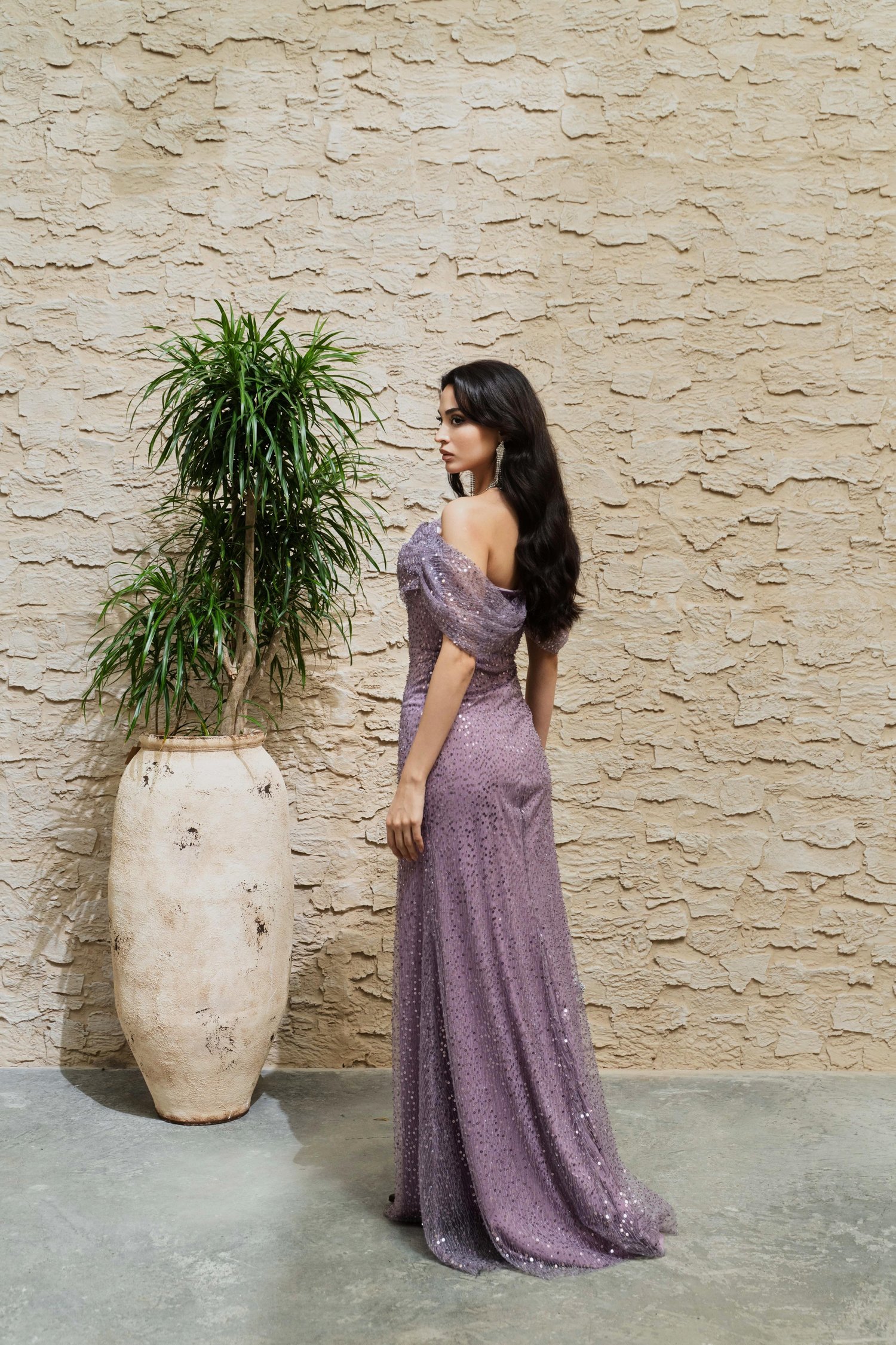 Lila Düşük Omuz Pul Payetli Straplez Abiye Elbise