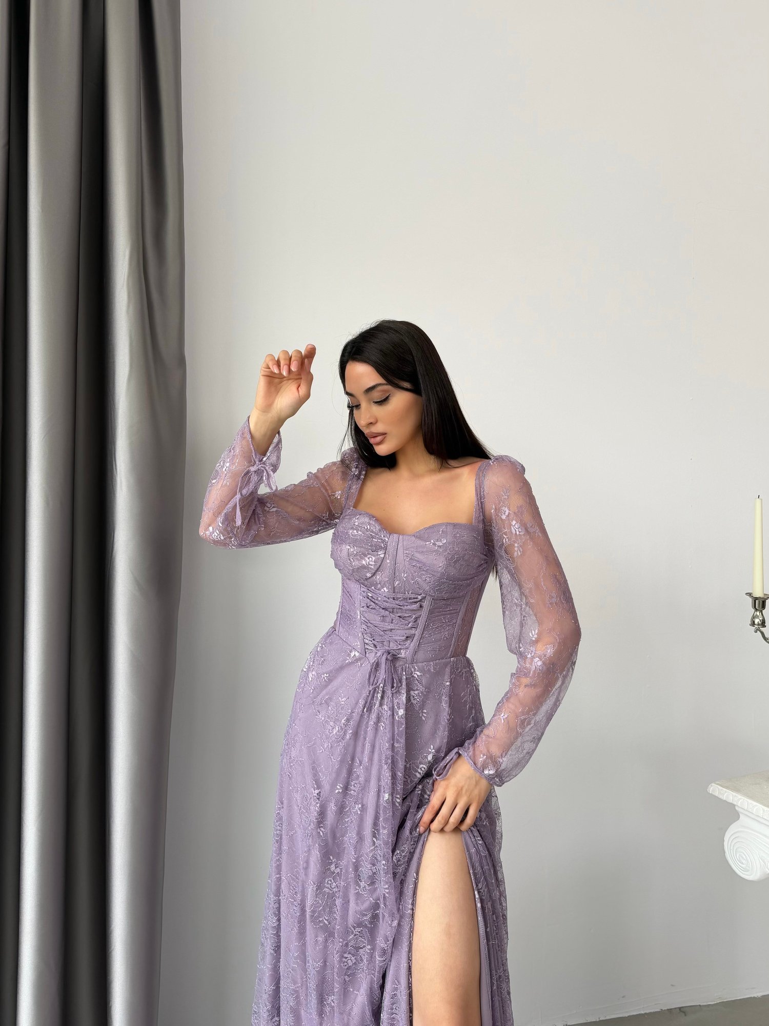 Romantik ve zarif tasarımıyla öne çıkan bu abiye elbise, feminen detaylarıyla dikkat çekici bir siluet sunar. Kalp yaka formundaki korse detaylı üst tasarım göğüs ve bel hattını zarif şekilde vurgularken, bel kısmındaki bağcıklı korse formu vücuda kusursuz bir uyum sağlar. Transparan dantel uzun kollar elbiseye romantik ve sofistike bir görünüm kazandırır. Akıcı ve dökümlü etek formu ile yan yırtmaç detayı hareketli ve iddialı bir stil oluşturur. Özel davetlerde zarif ve etkileyici bir görünüm sunar.