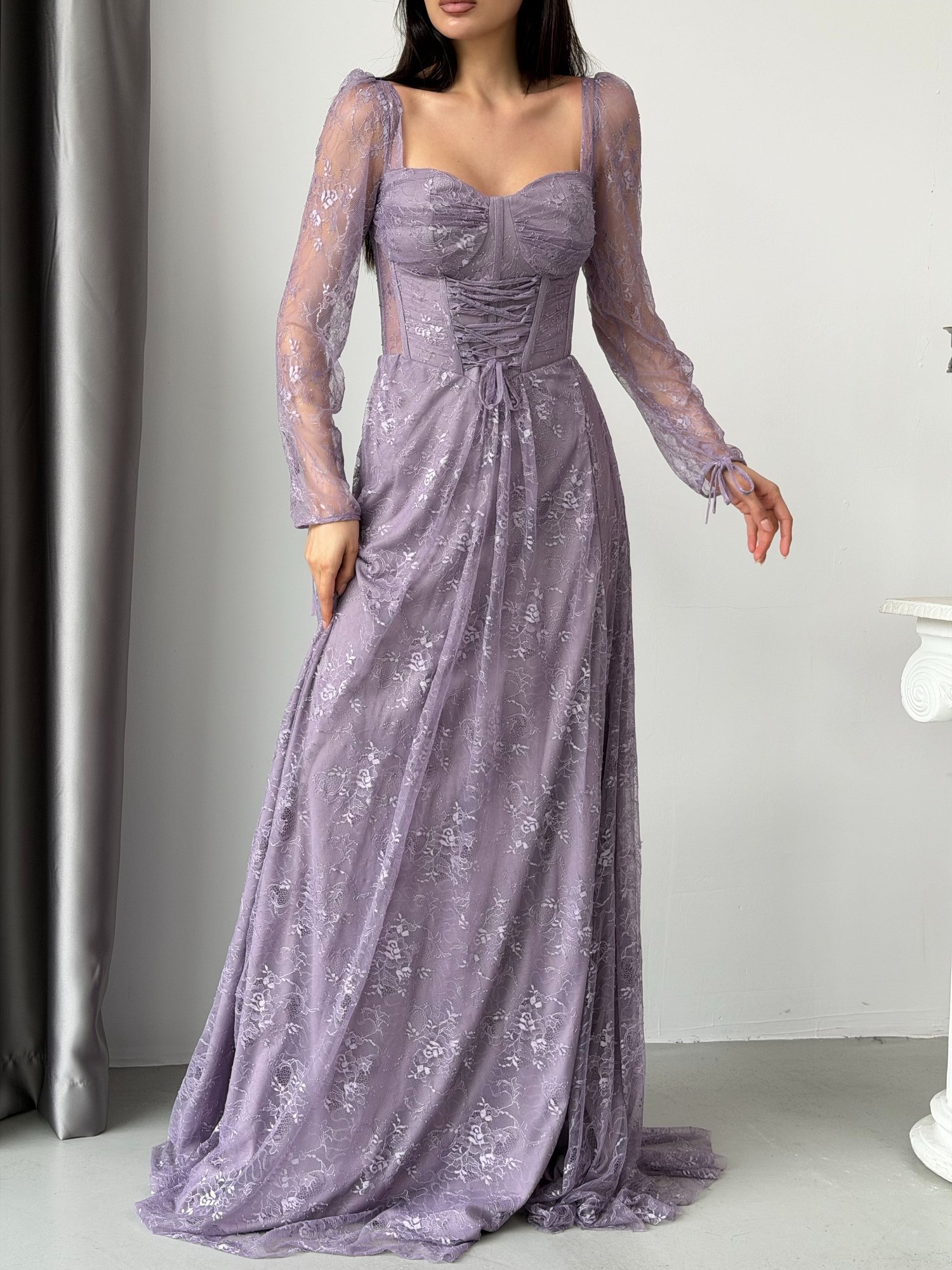 Lila Kalp Yaka Korse Detaylı Önü Bağlamalı Dantel Abiye Elbise