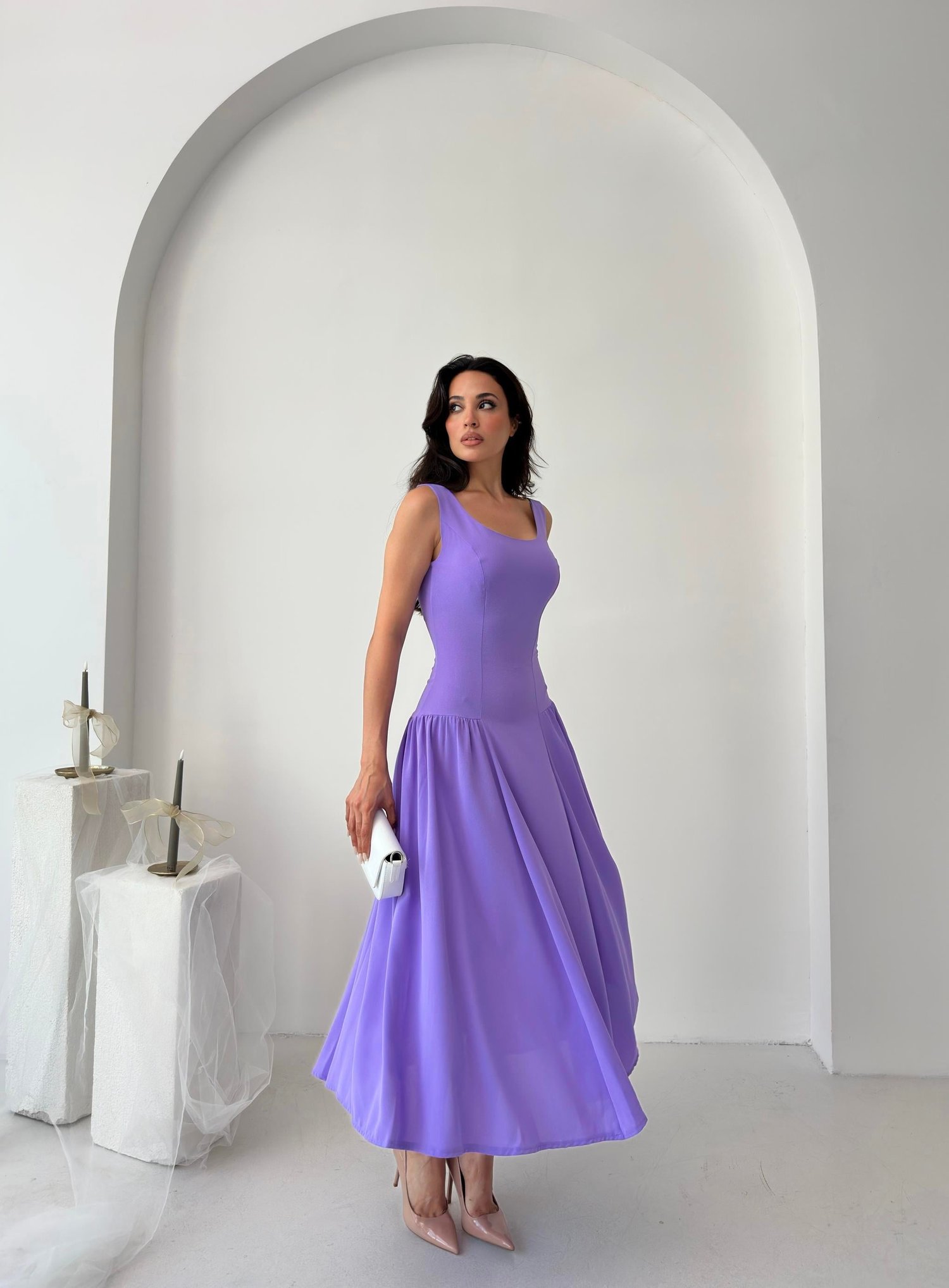 Lila Kare Yaka Gipeli Midi Elbise