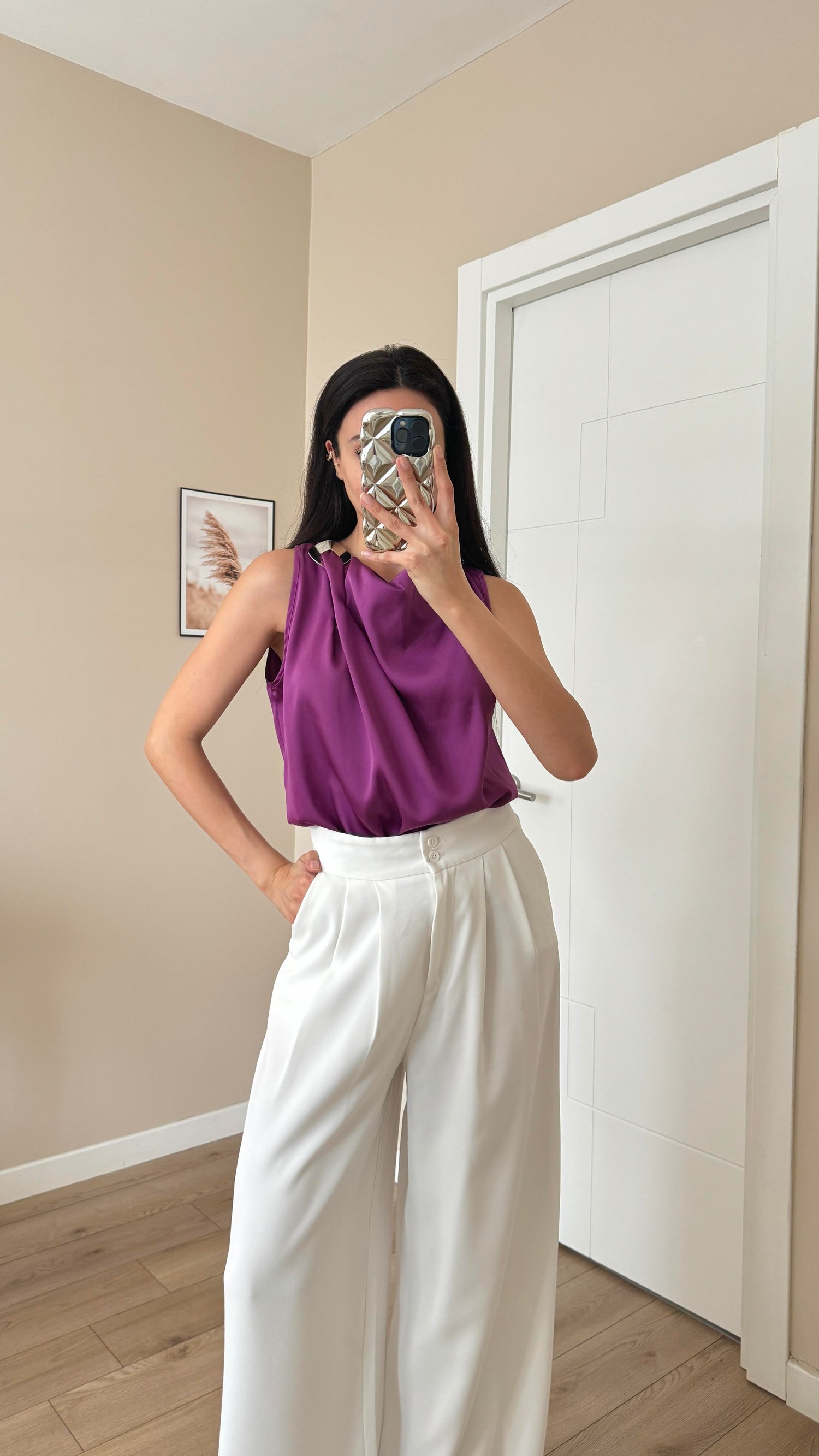 Lila Omuz Tokalı Degaje Yaka Kolsuz Bluz