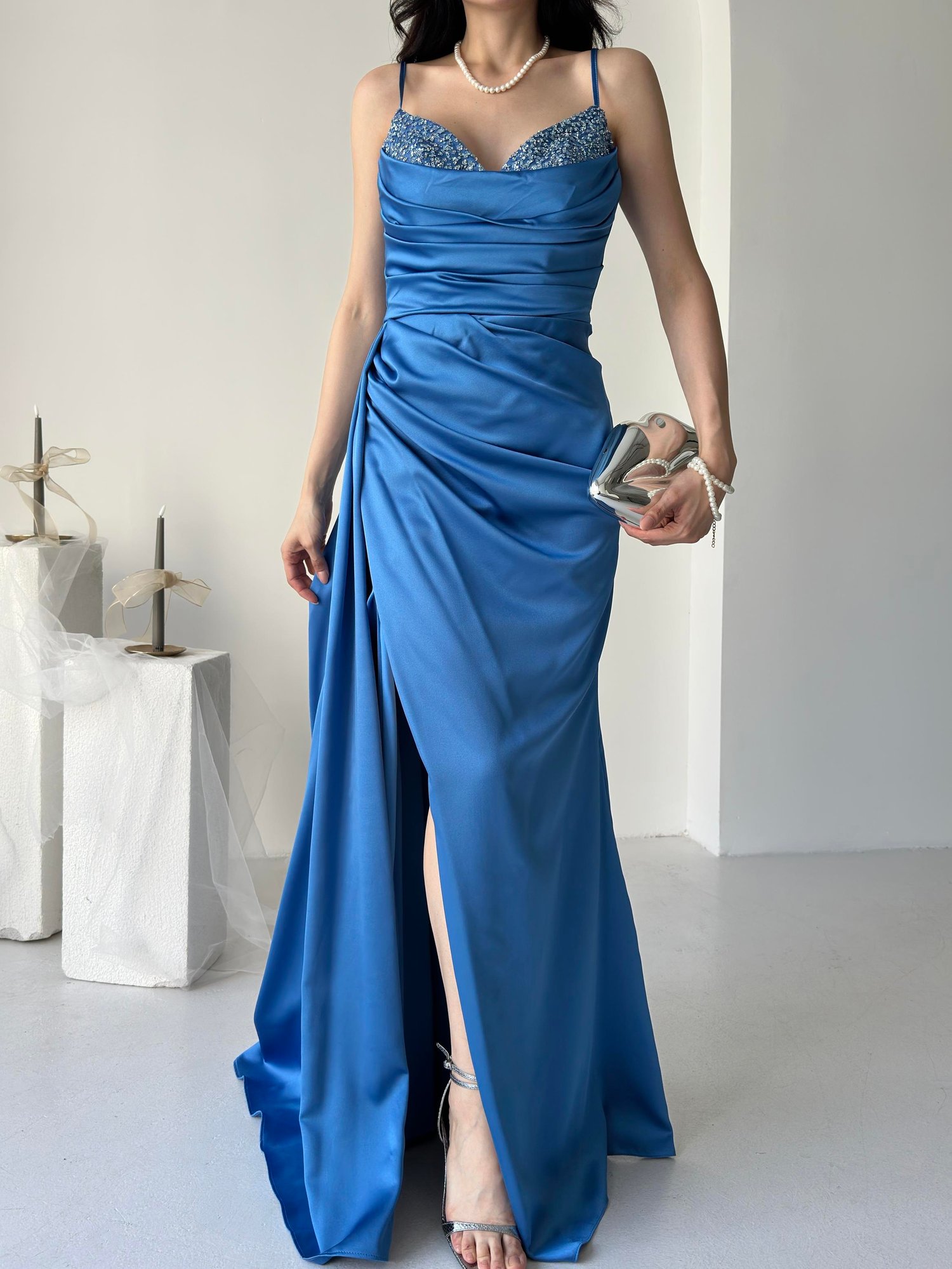Mavi Göğsü Taş Detaylı Drapeli Yırtmaçlı Saten Abiye Elbise