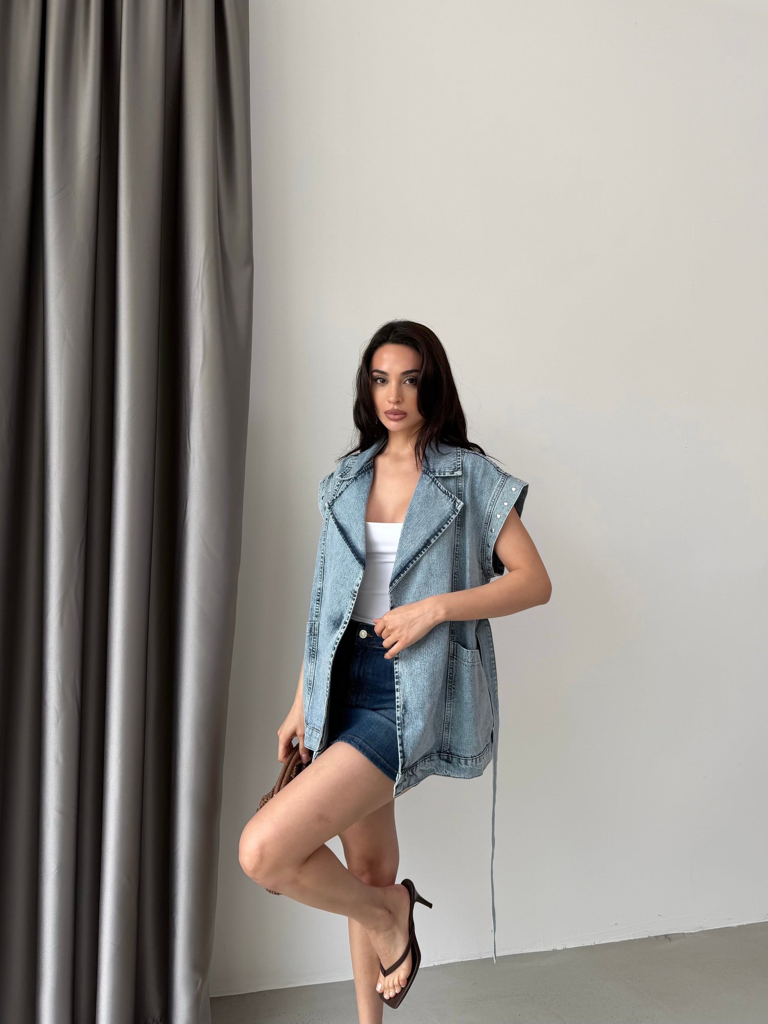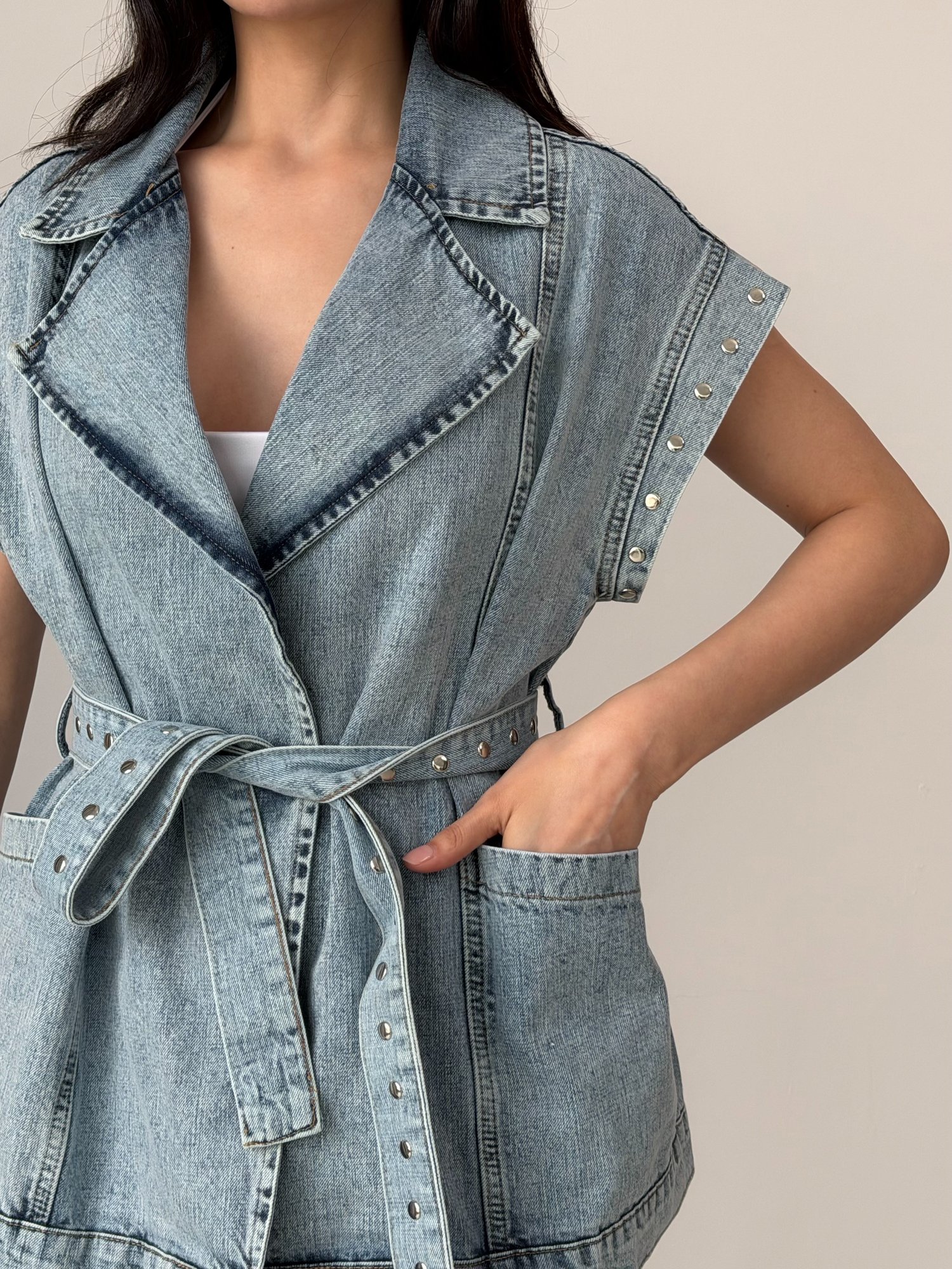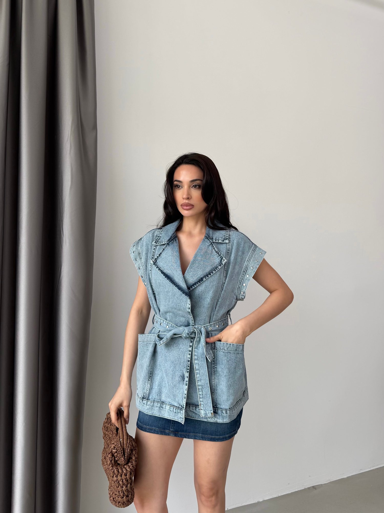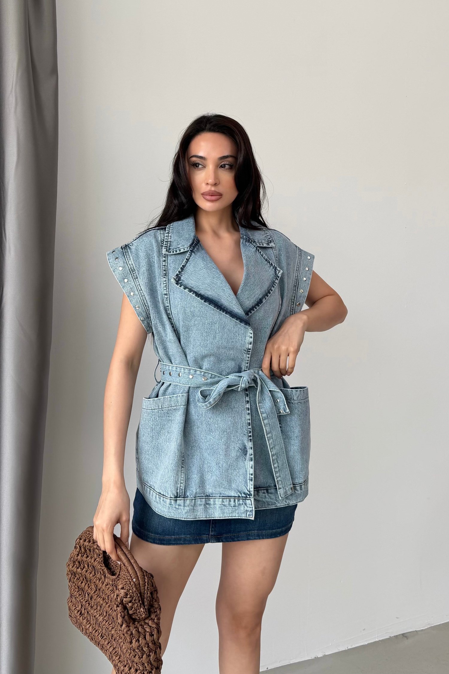 Ürün Açıklaması Modern ve casual şıklığı bir araya getiren bu denim yelek, güçlü omuz formu ve fonksiyonel detaylarıyla dikkat çeker. Geniş kesimli yakası ve kruvaze kapanış formu tasarıma dinamik bir görünüm kazandırırken, bel kısmındaki bağlama detayı vücut formunu zarif şekilde ortaya çıkarır. Oversize kesimi ve cep detayları ile hem stil sahibi hem de kullanışlı bir parçadır. Günlük kombinlerden şehir stiline kadar geniş bir kullanım alanı sunar.