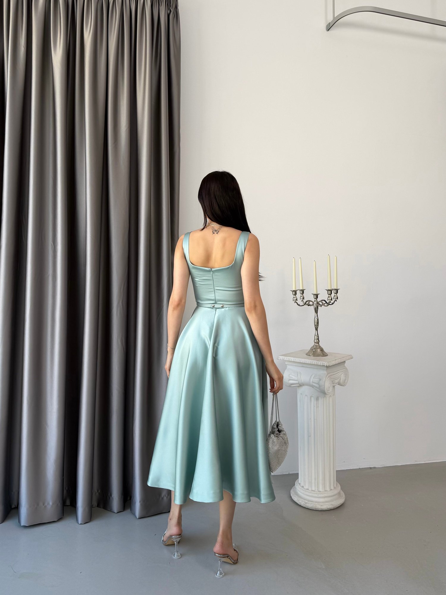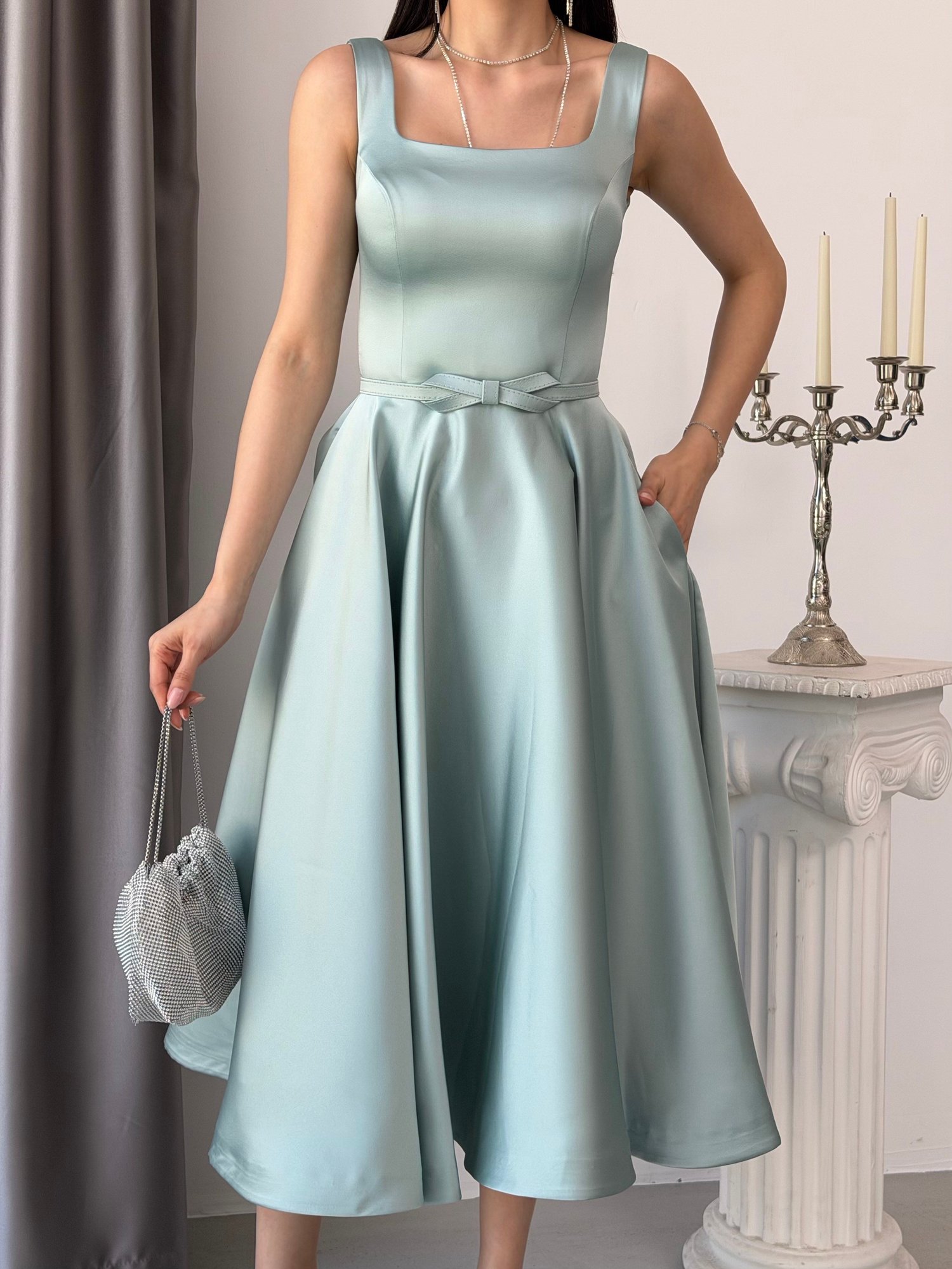 Mint Kare Yaka Askılı Kemerli Saten Midi Abiye Elbise