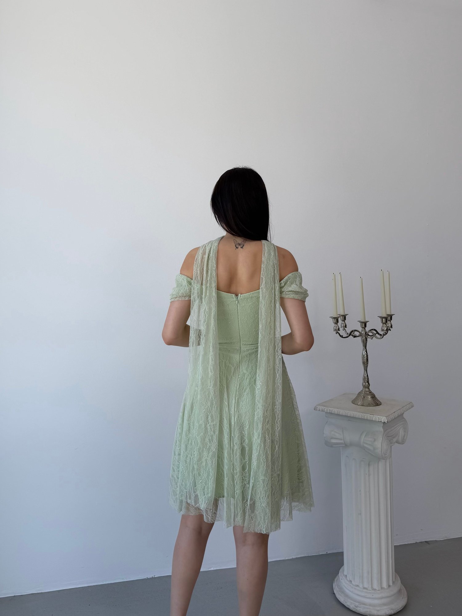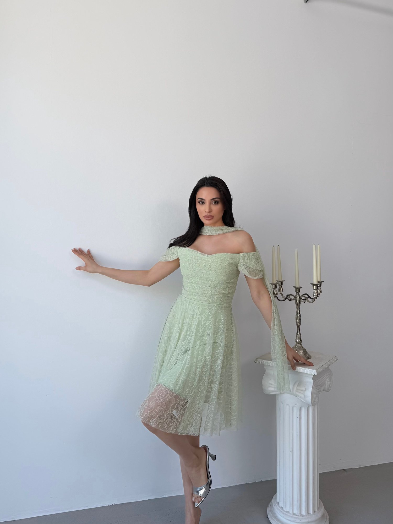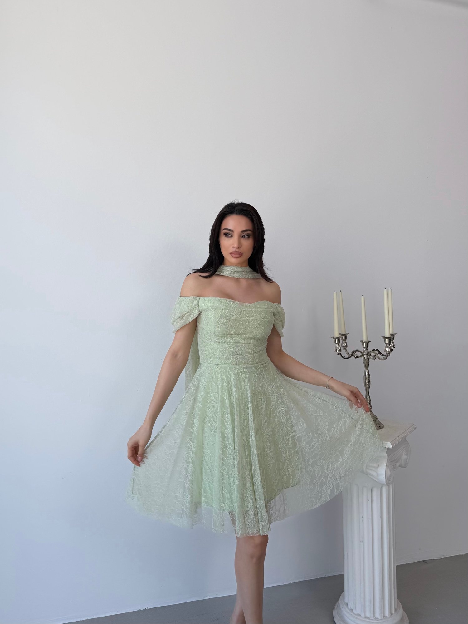 Mint Omuz Fular Detaylı Dantel Kumaş Kısa Abiye Elbise