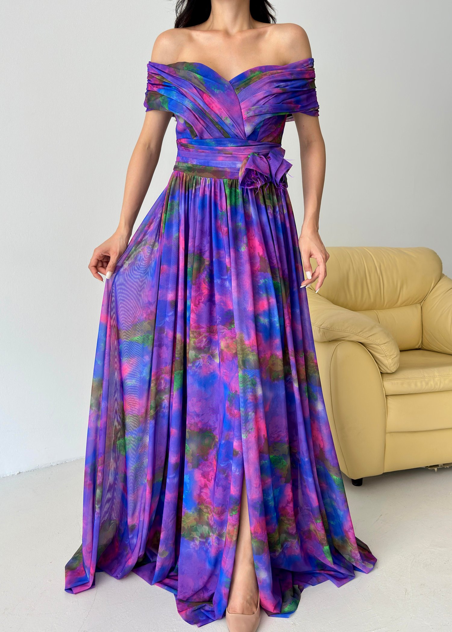 Mor Kayık Yaka Desenli Tül Abiye Elbise