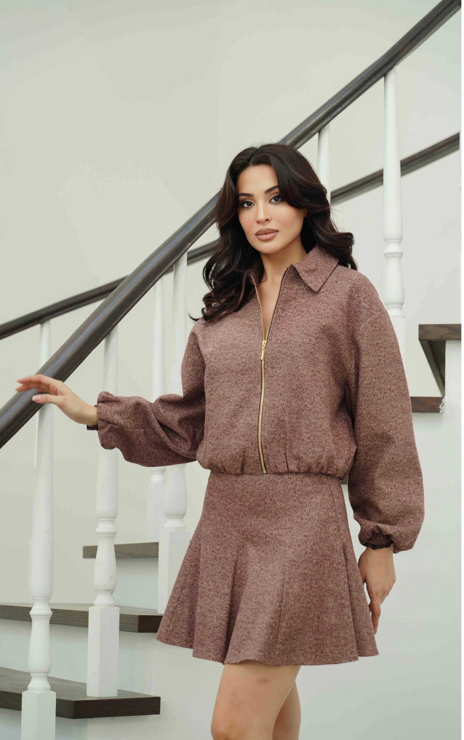 Mürdüm Beli Lastikli Fermuarlı Ceket Etek Takım Kahve Beli Lastikli Fermuarlı Ceket Etek Takım Bej Beli Lastikli Fermuarlı Ceket Etek Takım