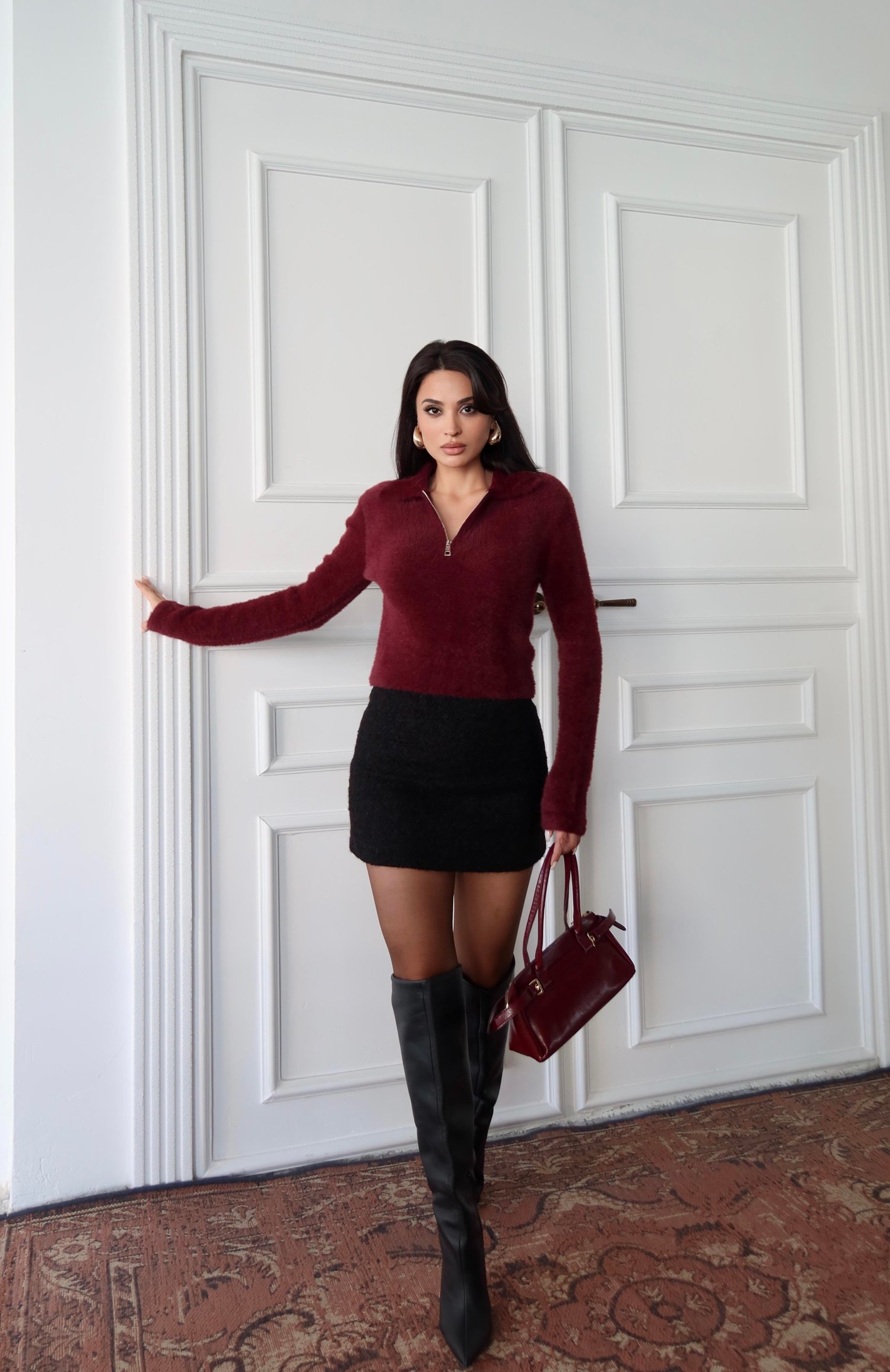 Mürdüm Fermuarlı Yumuşak Dokulu Triko Kazak
