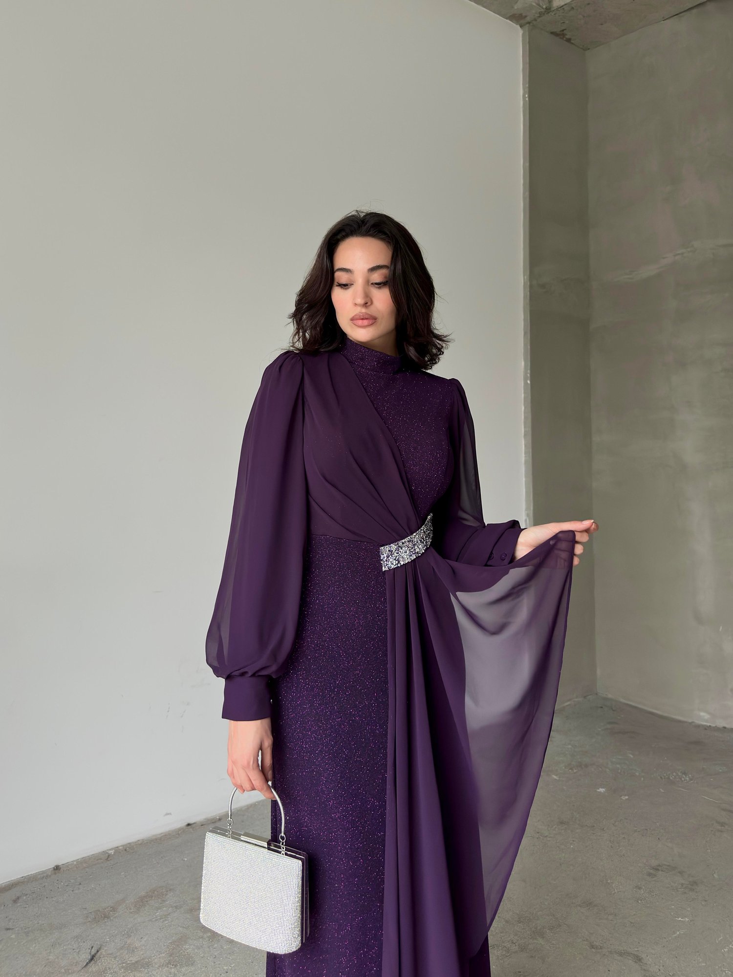 Mürdüm Taş Detaylı Uzun Kol Simli Abiye Elbise