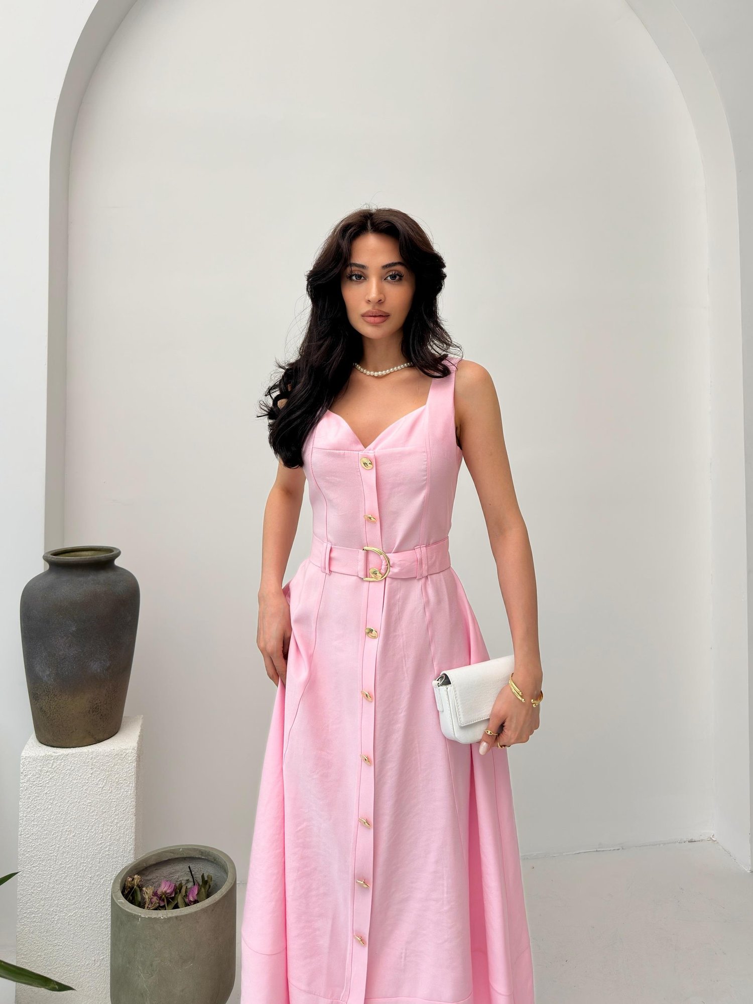 Pudra Askılı Kemer Detaylı Düğmeli Tensel Elbise