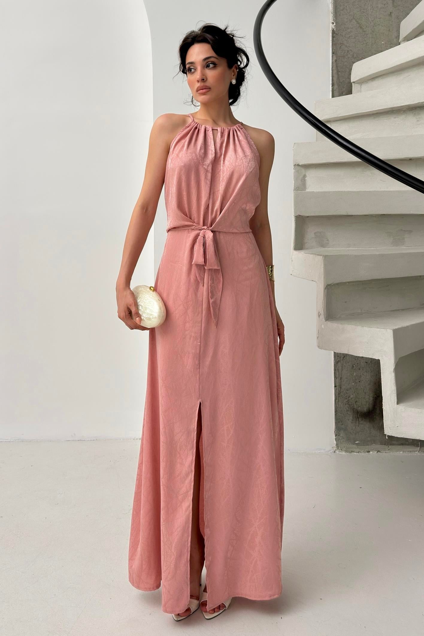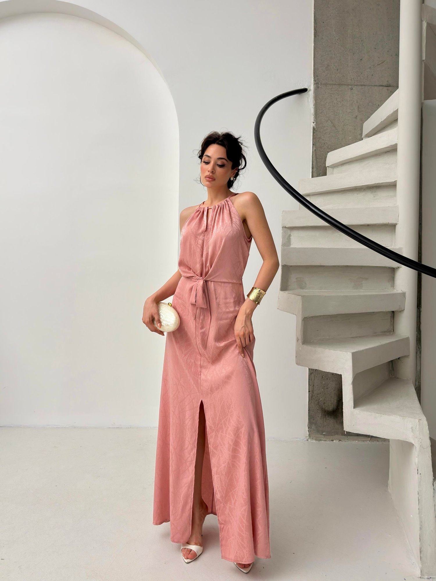 Pudra Bağlama Detaylı Yırtmaçlı Saten Elbise