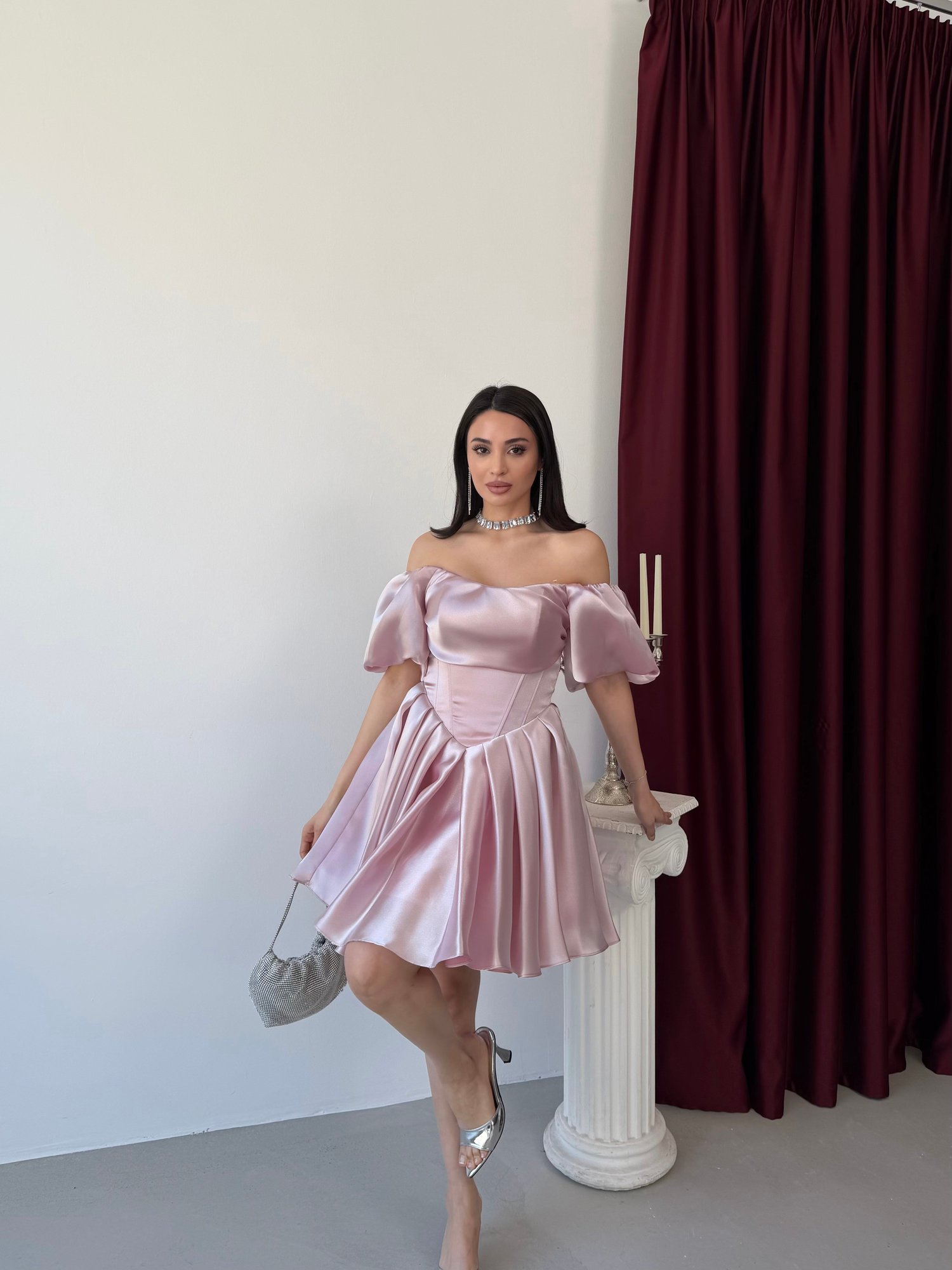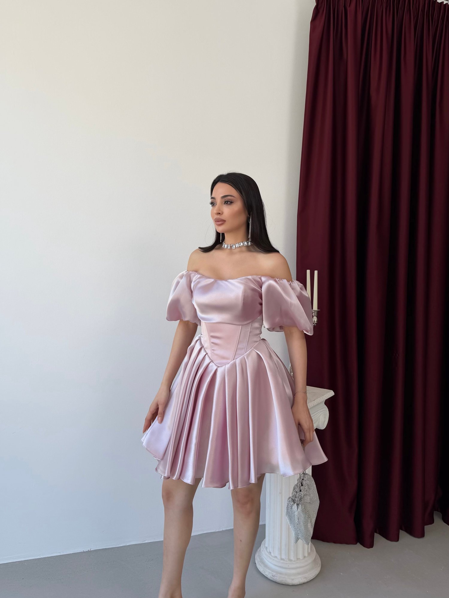 Pudra Balon Kol Korse Detaylı Kısa Mezuniyet Elbisesi