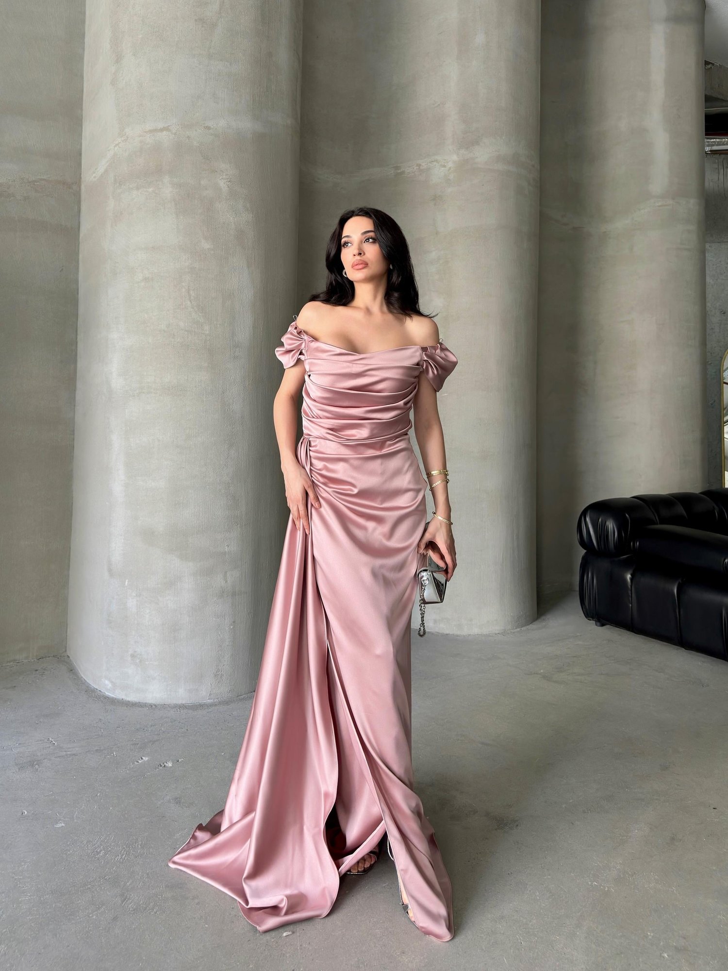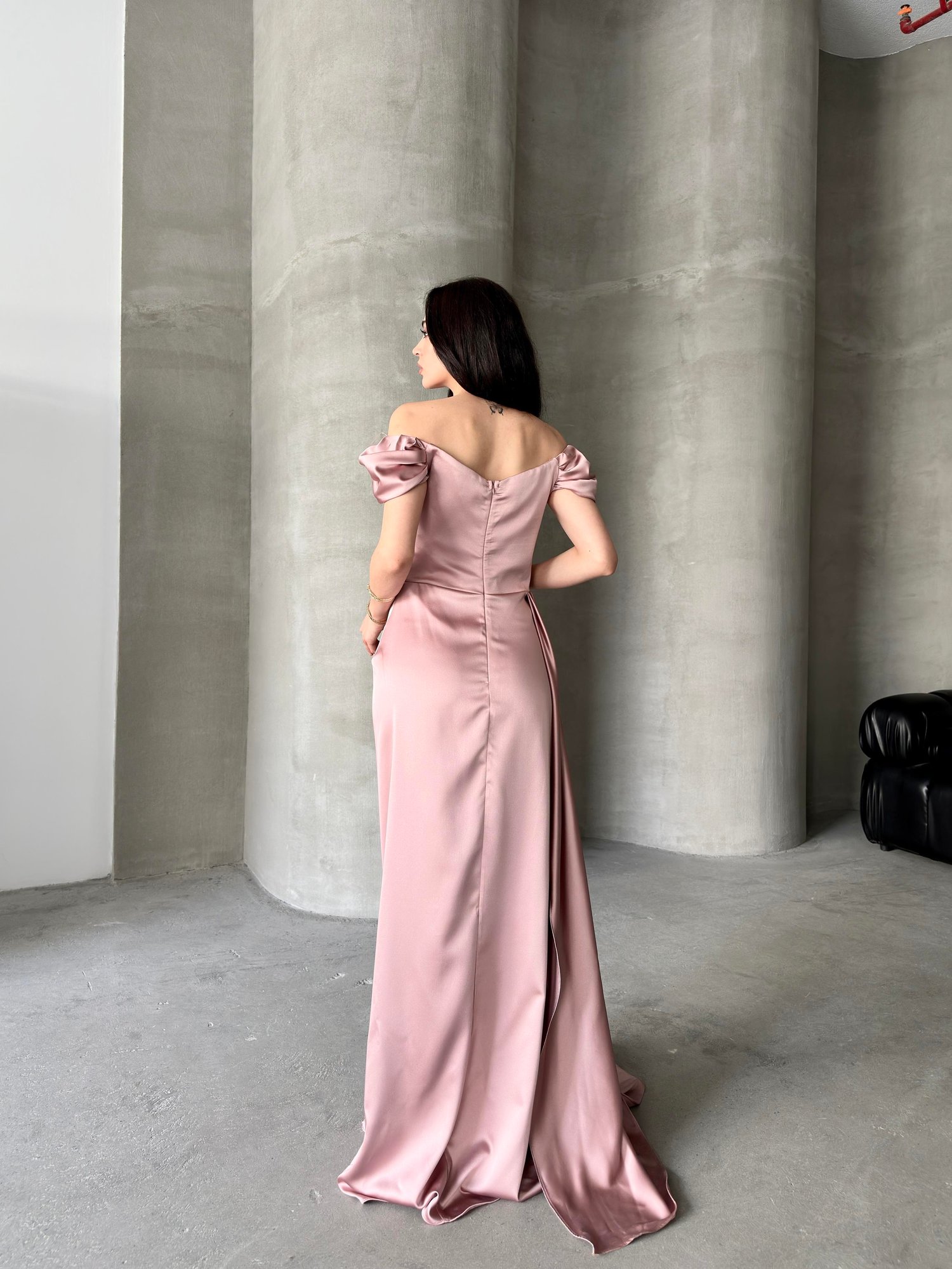 Pudra Düşük Omuz Drapeli Abiye Elbise
