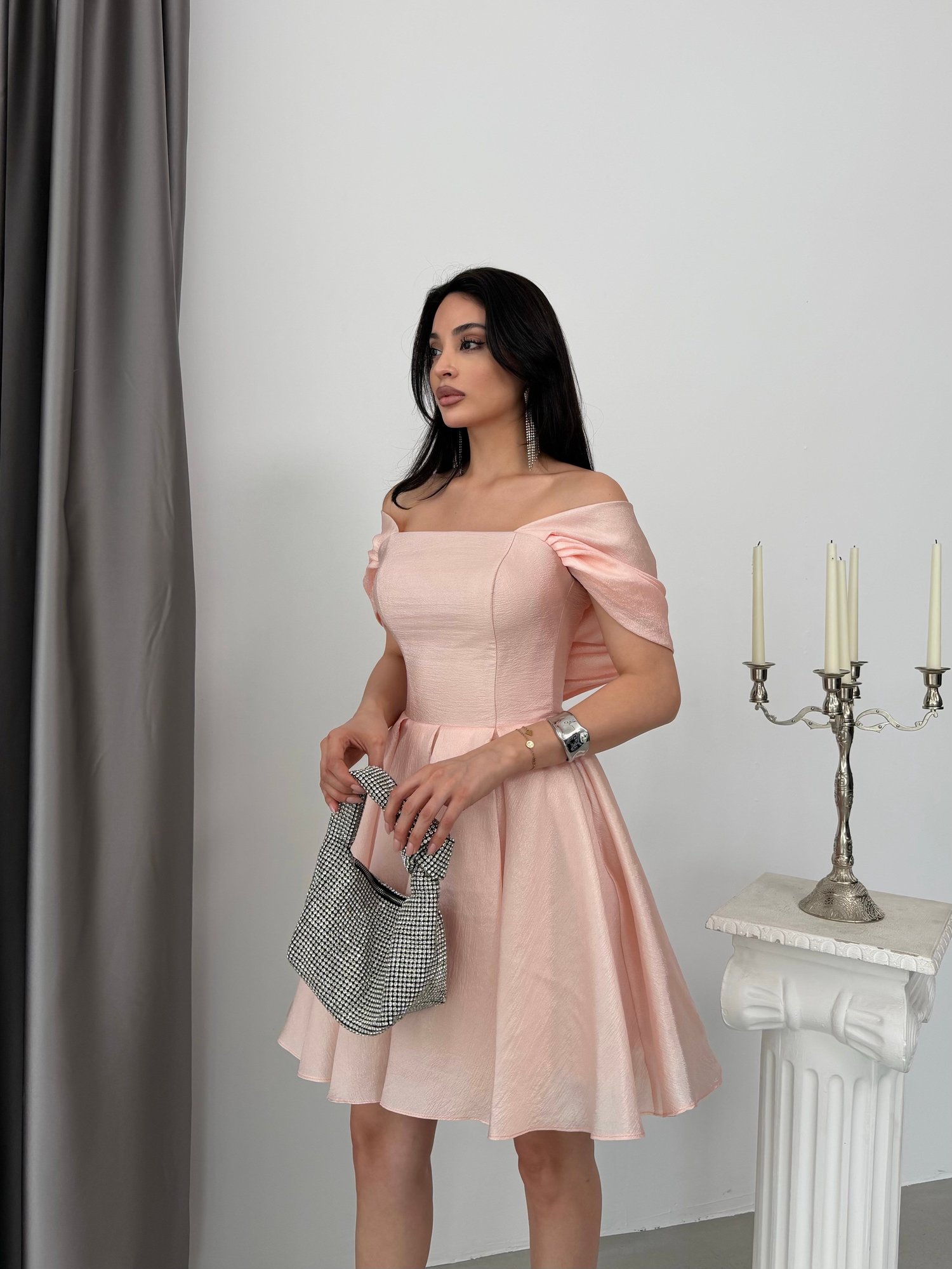 Kombin Önerisi: Şeffaf veya taş detaylı topuklu ayakkabılarla kombinlenebilir. İnci detaylı çanta ve zarif kolyelerle görünüm tamamlanabilir. Minimal aksesuarlarla elbisenin hareketli yapısı ön plana çıkarılabilir.