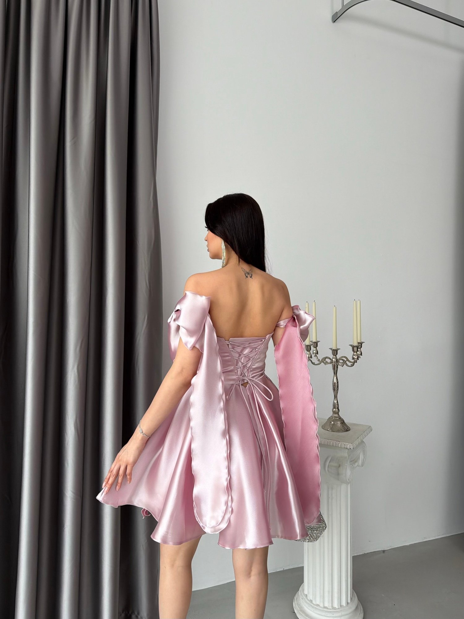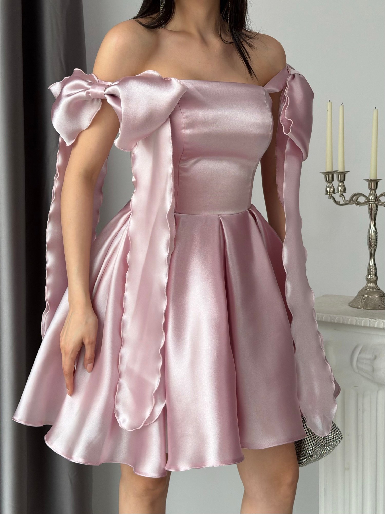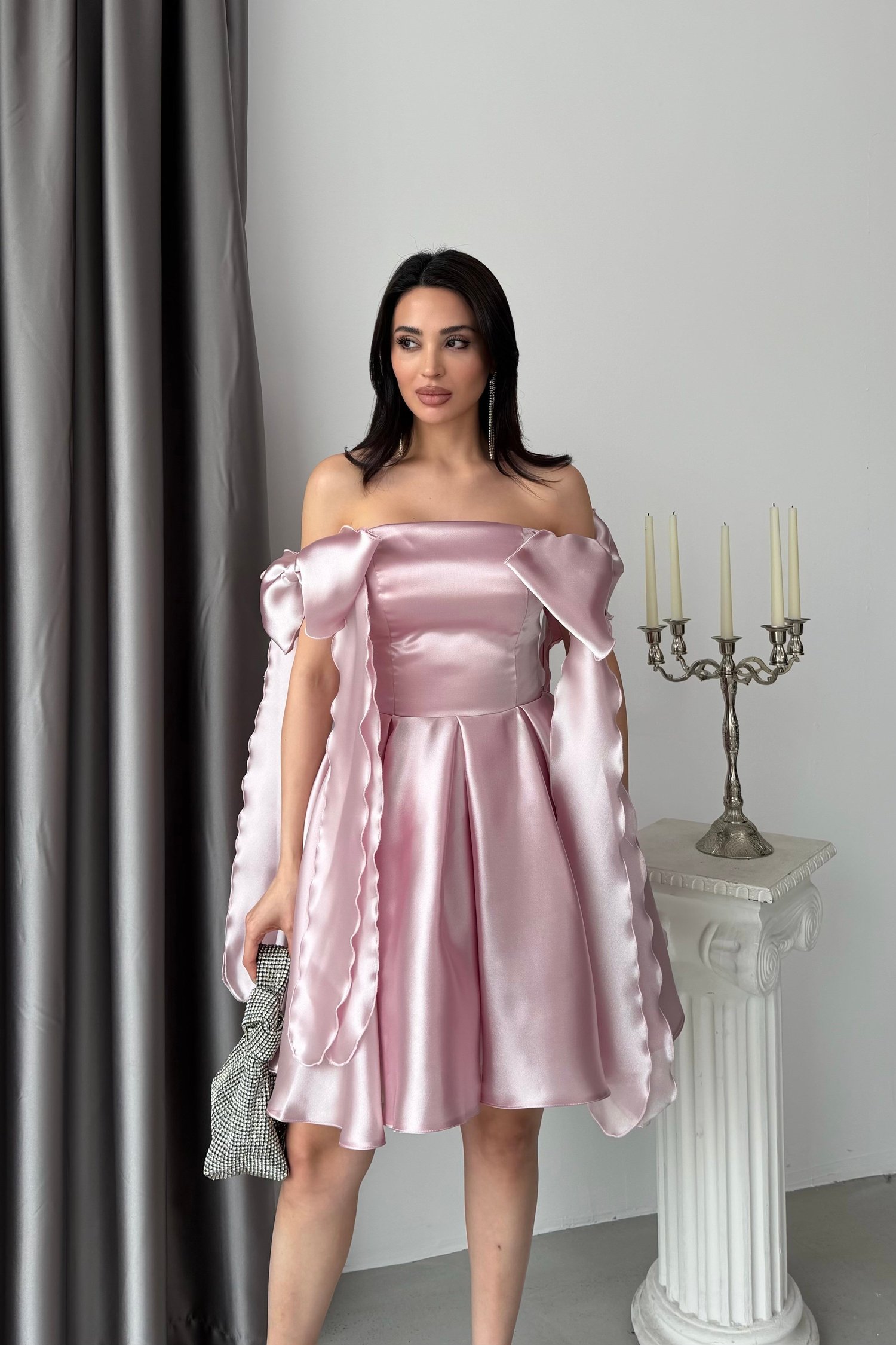 Pudra Fiyonk Askılı Kısa Organze Mezuniyet Elbisesi